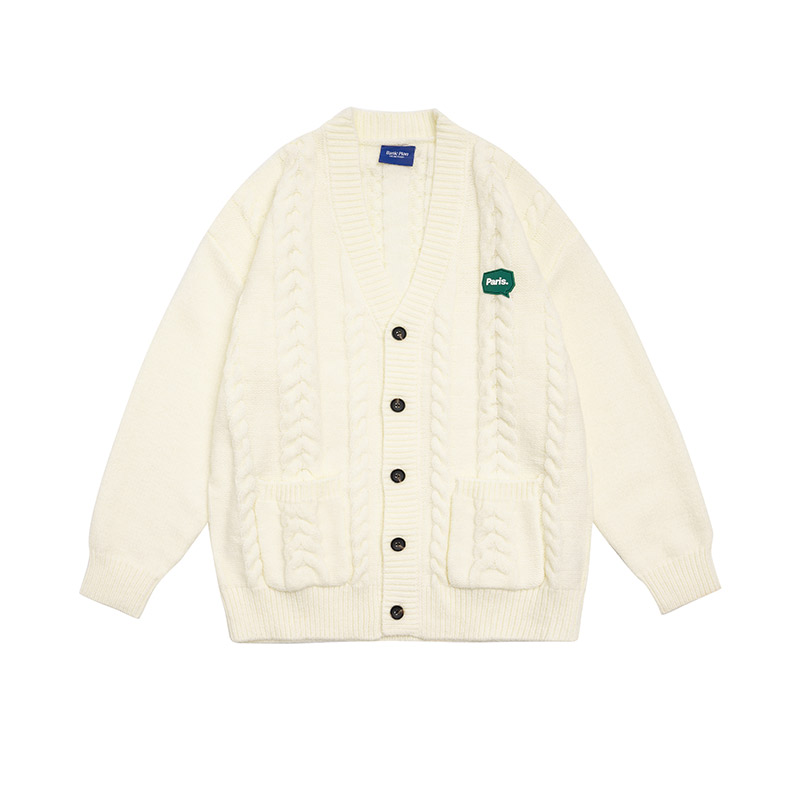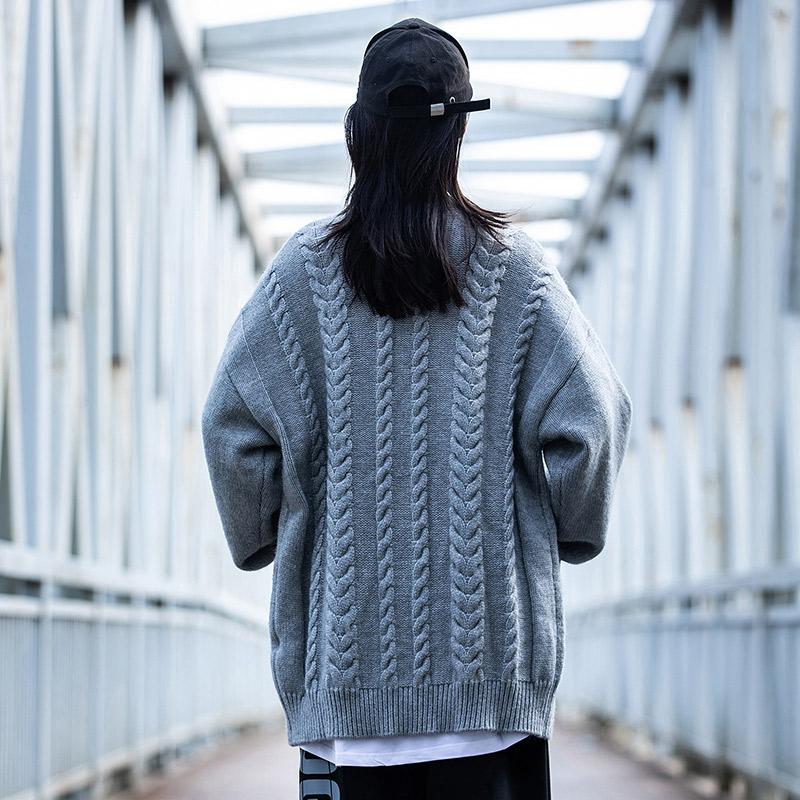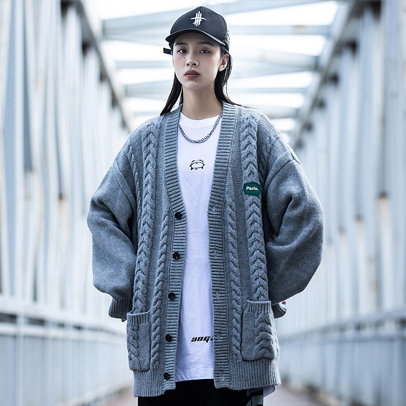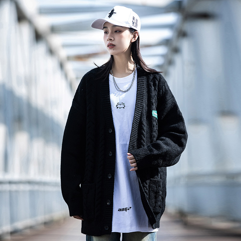 小彬国潮牌V领开衫毛衣男秋冬季宽松麻花纹上衣针织衫情侣装外套