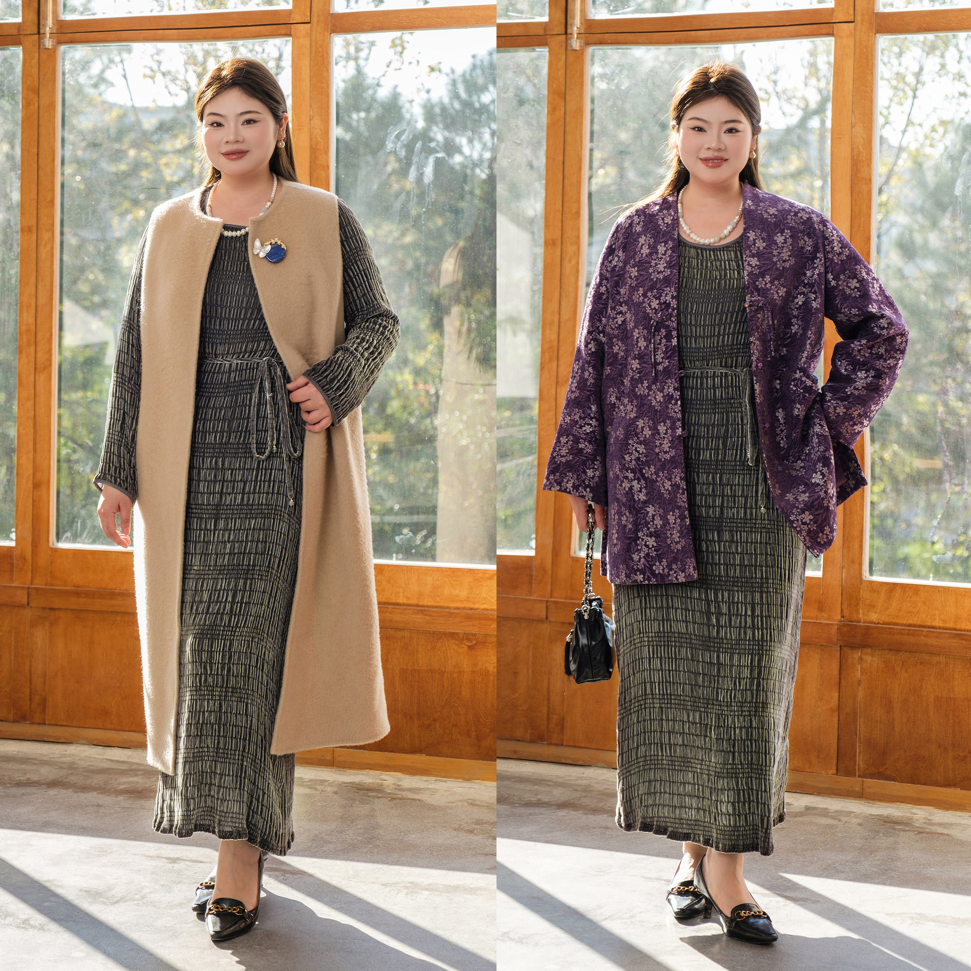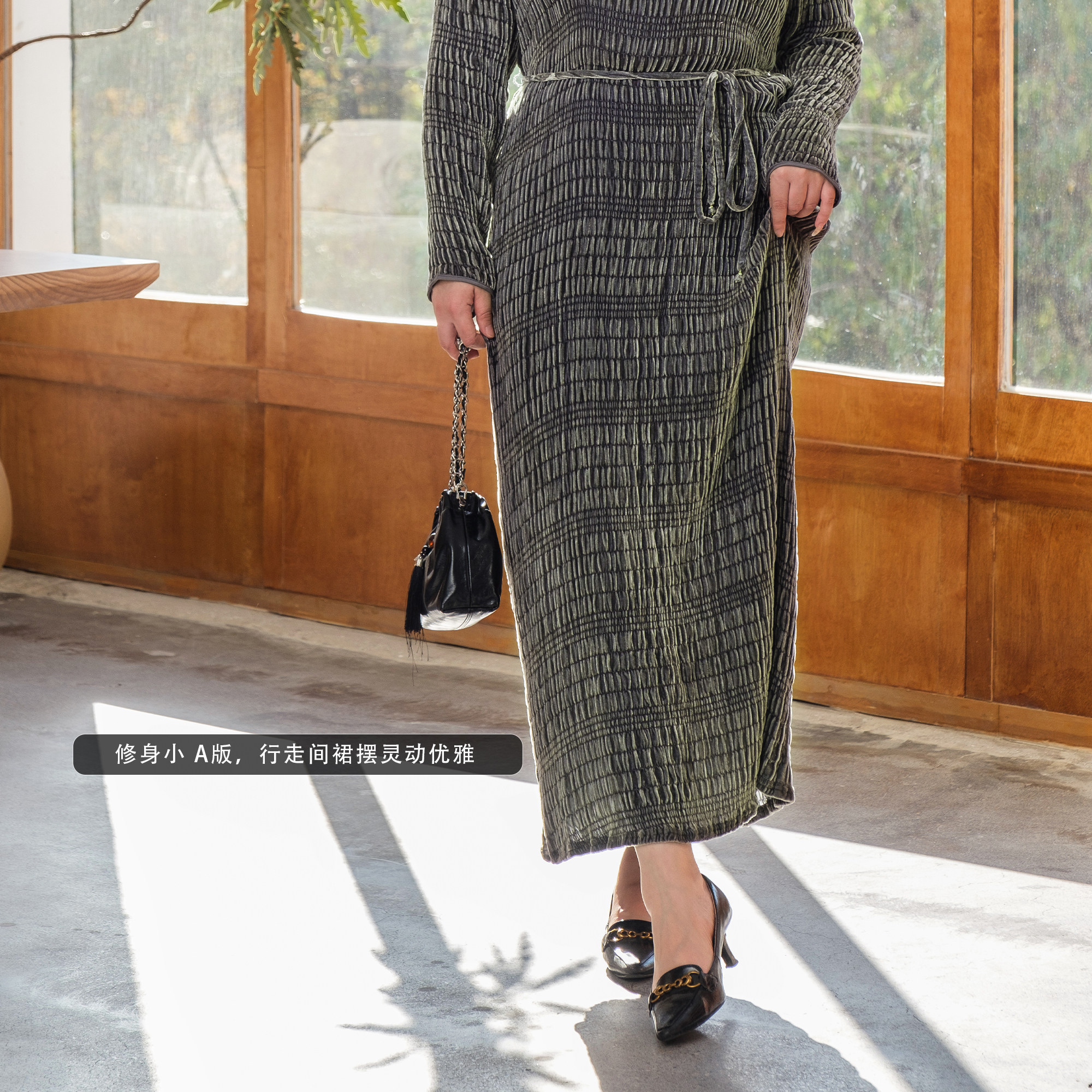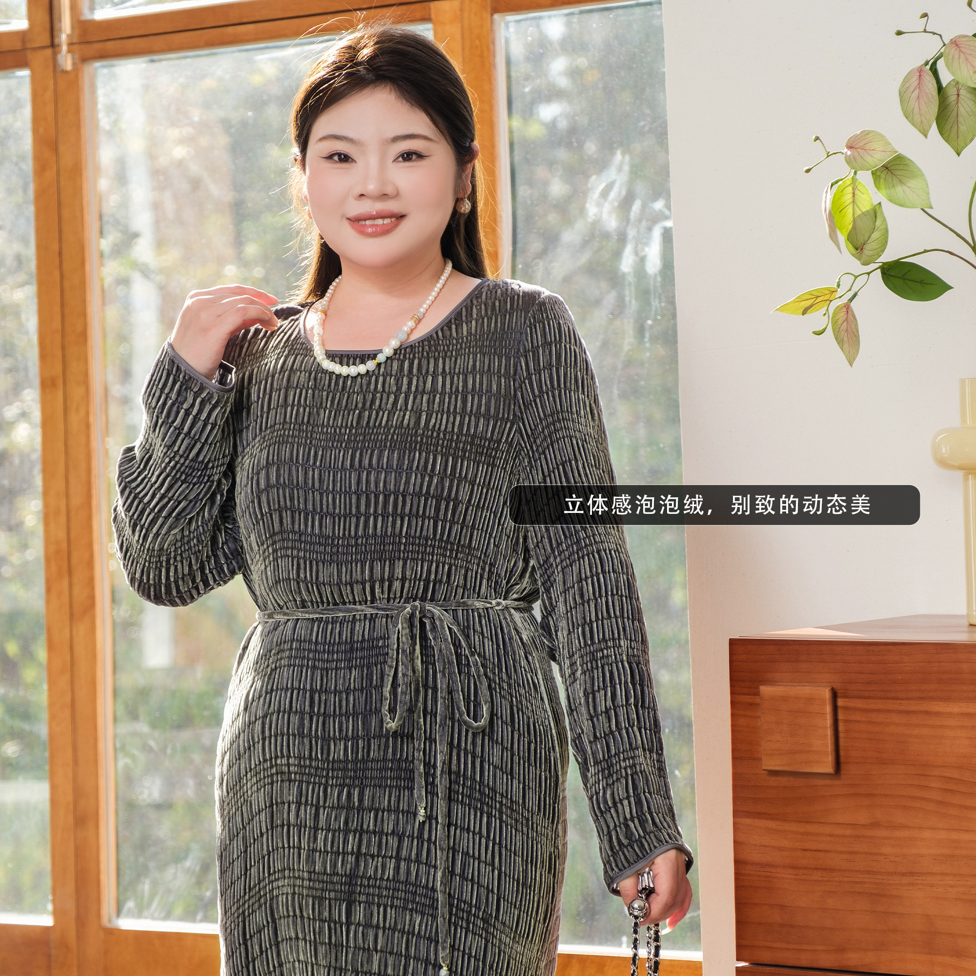 【真丝泡泡绒】美丽客栈秋冬新款高级感长袖圆领连衣裙女大码女装