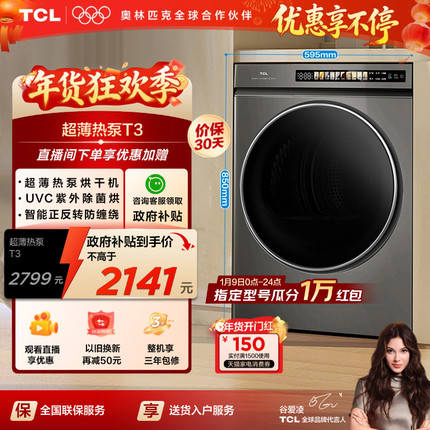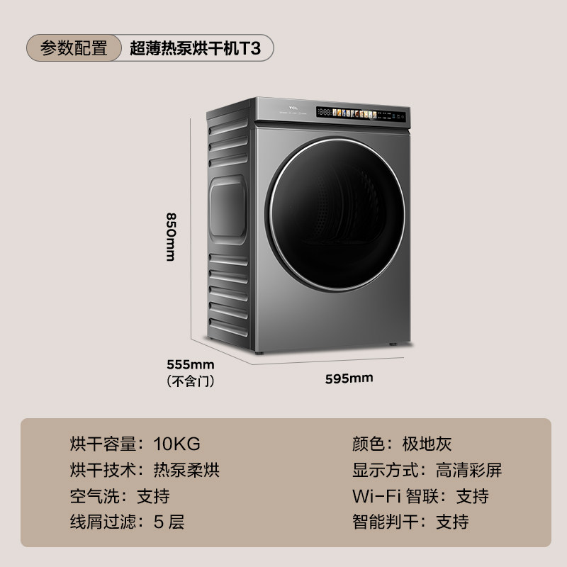 TCL 10KG超薄热泵烘干机T3 智能正反转 UVC除菌全自动烘干机家用