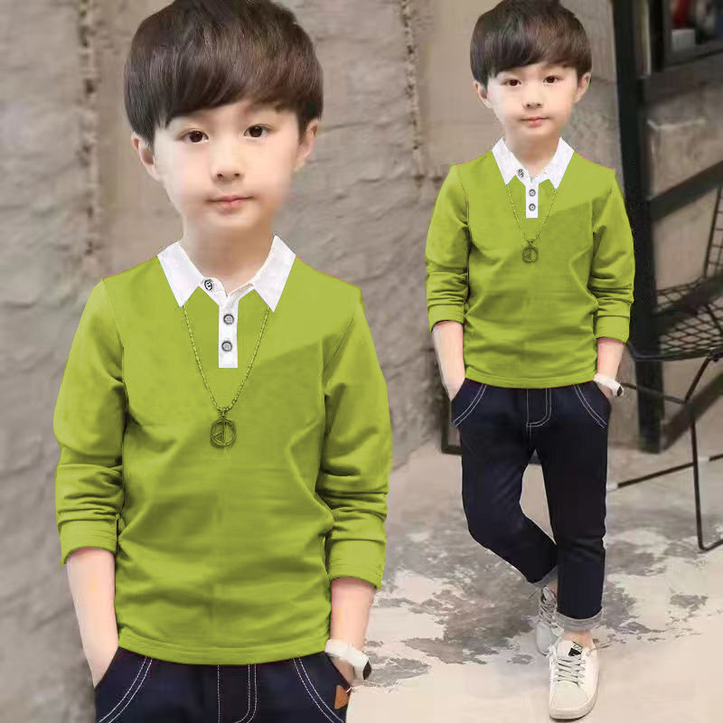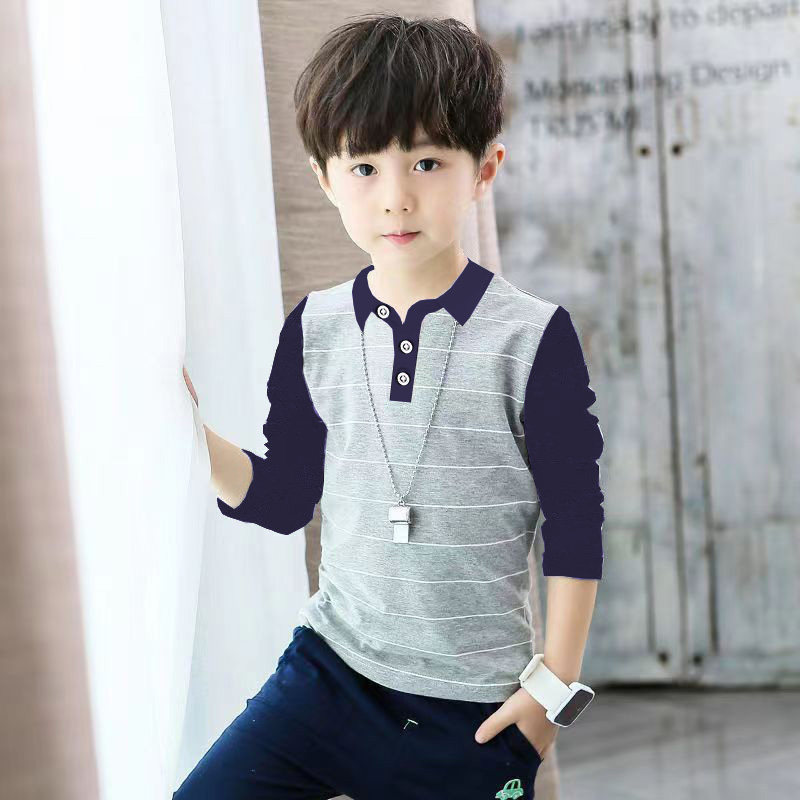 童装男童长袖翻领T恤春秋新款中大童上衣纯棉条纹圆领薄款打底衫