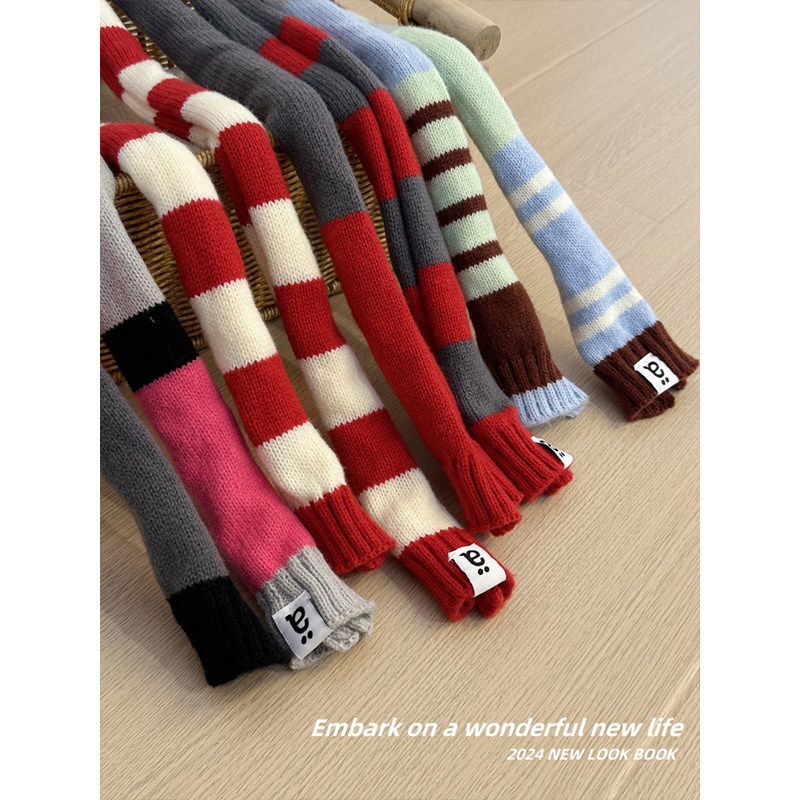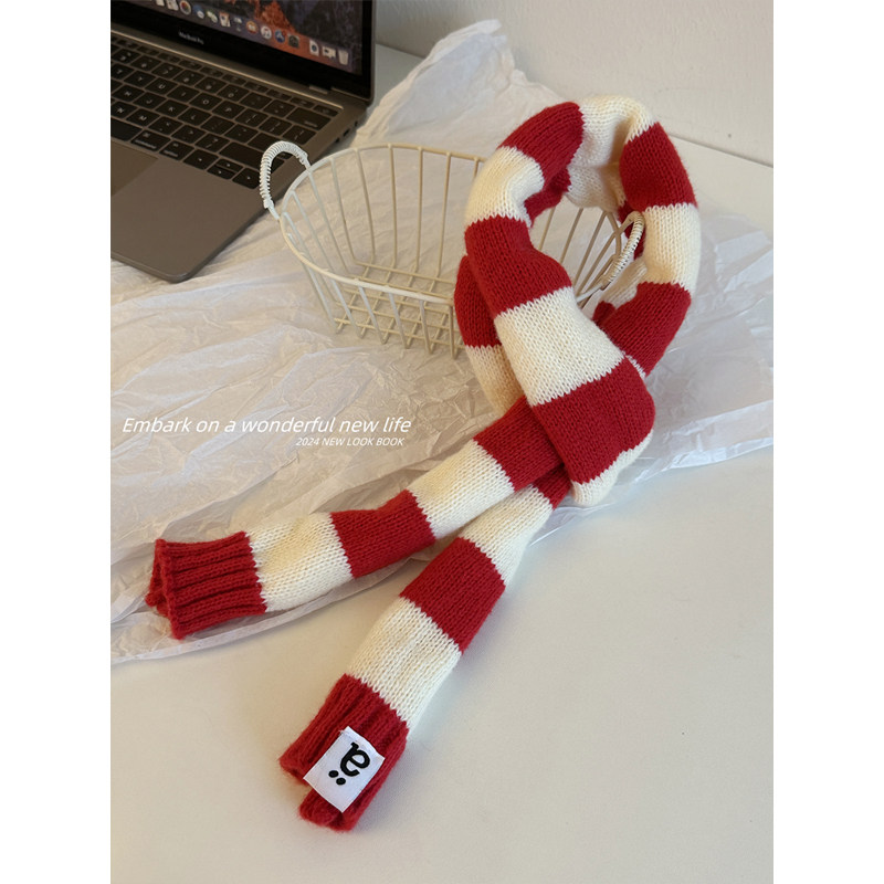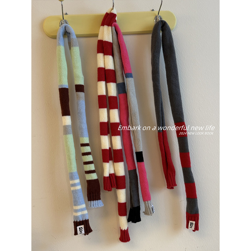 小众高级感韩版腊肠毛线针织围巾女秋冬季时尚拼色条纹细长条围脖