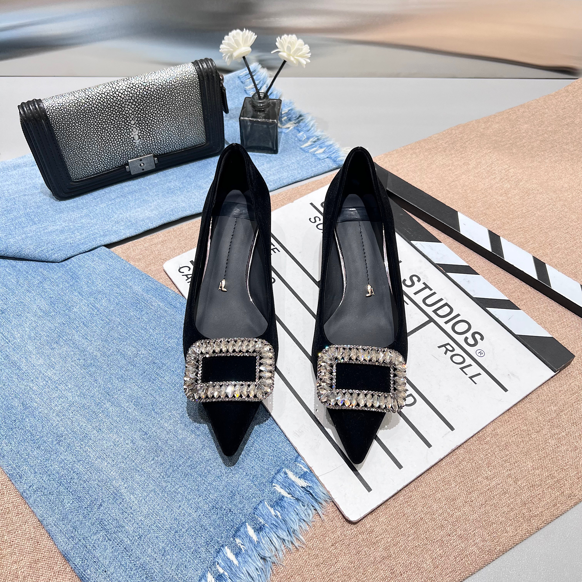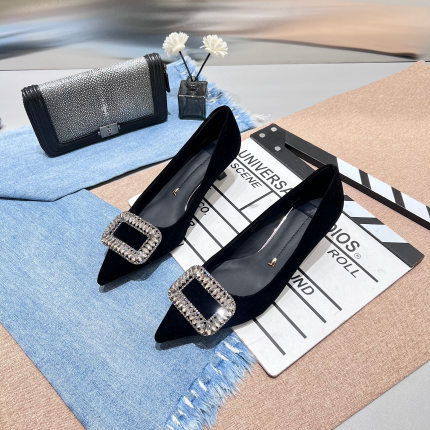 2025秋季新款小低跟尖头浅口高跟鞋女细跟绒面方扣水钻配裙子单鞋