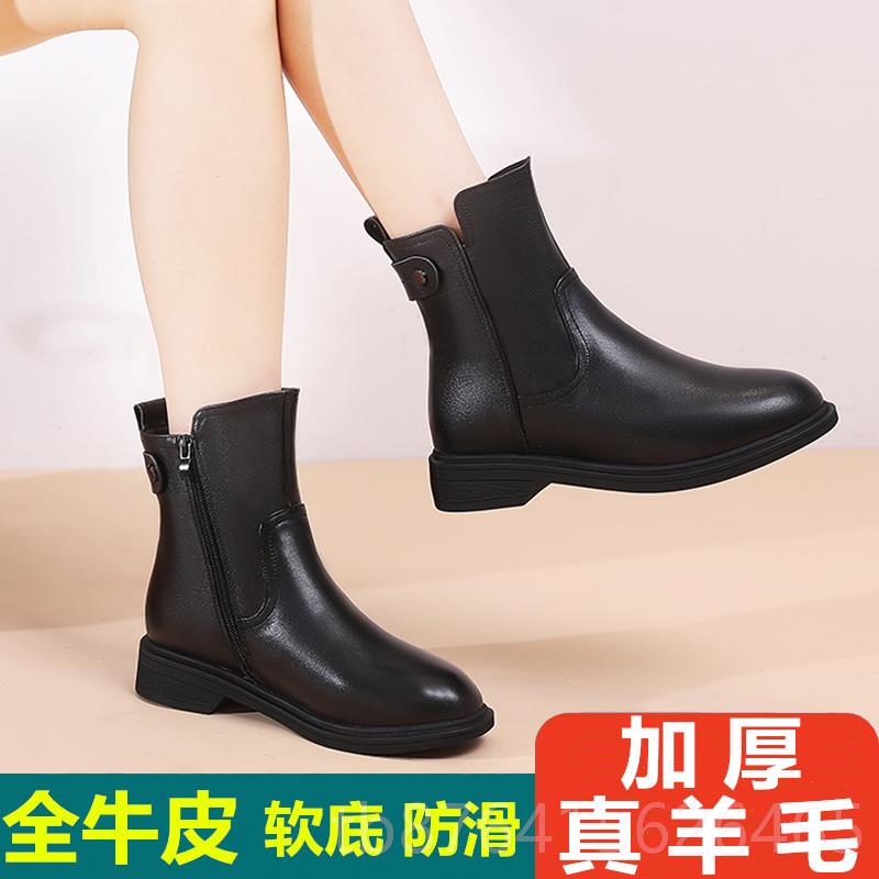 正品秋冬季新真皮软皮平羊底女靴加绒加厚保暖妈子妈短靴毛棉靴款