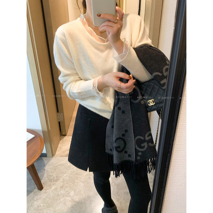 爱情魔鬼鱼 米白色长袖蕾丝拼接针织衫女2025年冬季新款套头上衣