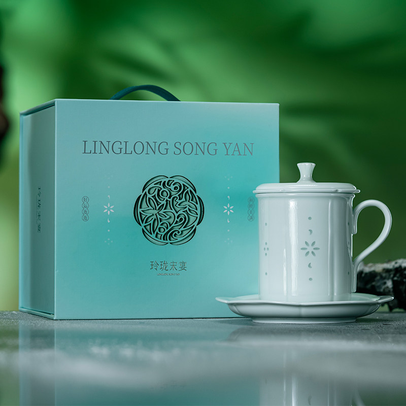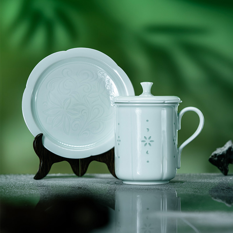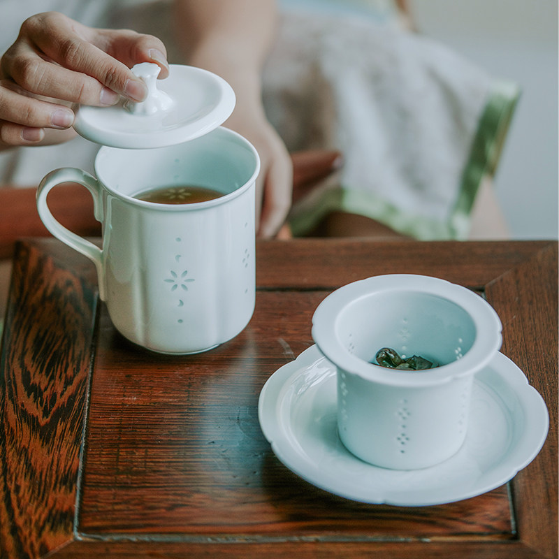 景德镇玲珑青瓷陶瓷茶杯带盖过滤杯碟办公室泡茶茶水分离陶瓷水杯