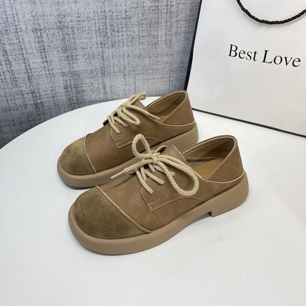 软皮磨砂复古单鞋女2024新款春季平底百搭英伦风小皮鞋圆头系带