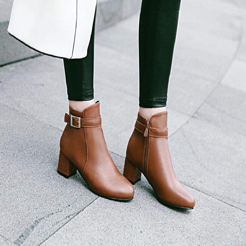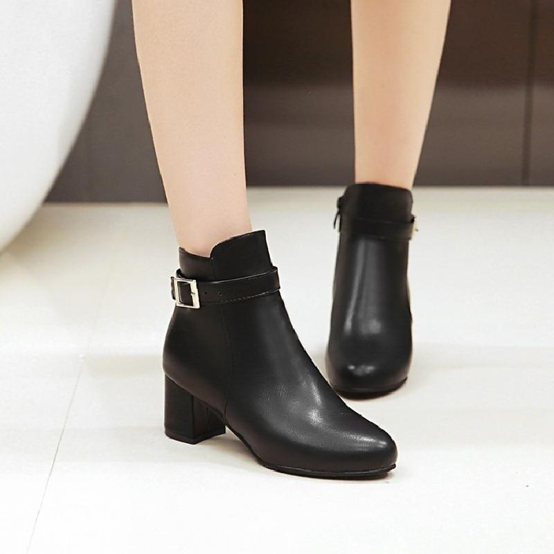 秋冬季新款韩版女靴子粗跟高跟马丁靴皮带扣短筒靴白色大码女鞋子