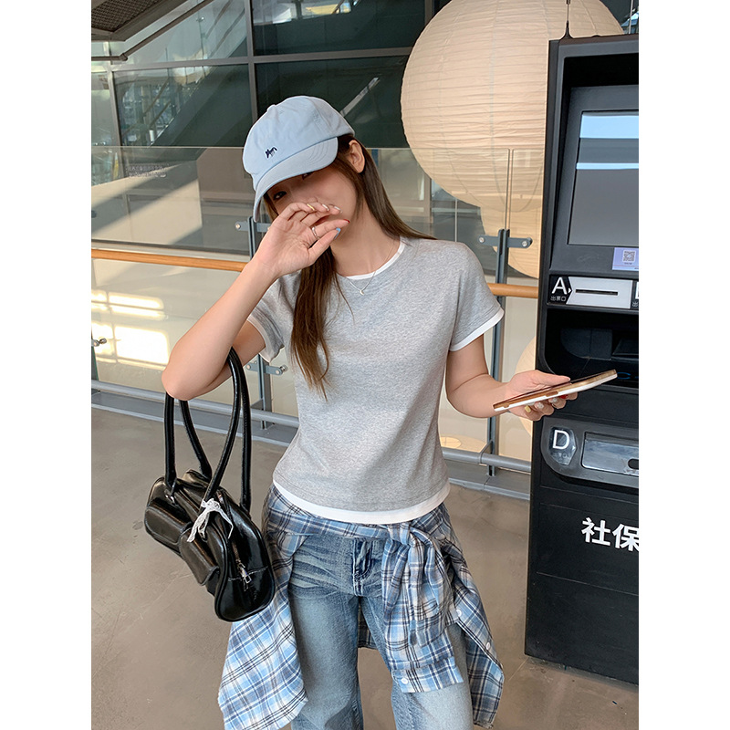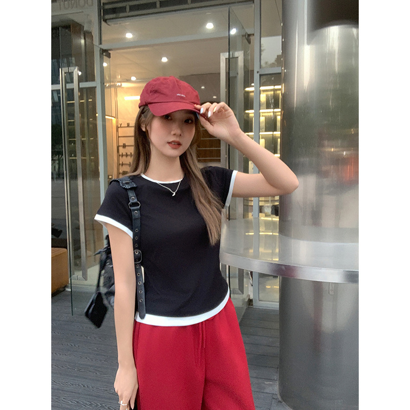 圆领黑白撞色假两件短袖t恤女纯棉百搭设计感正肩修身甜辣妹上衣