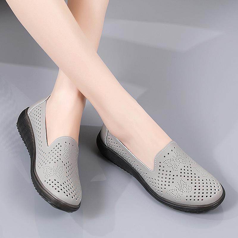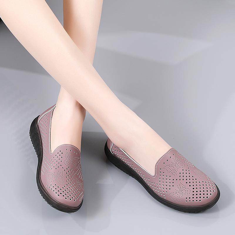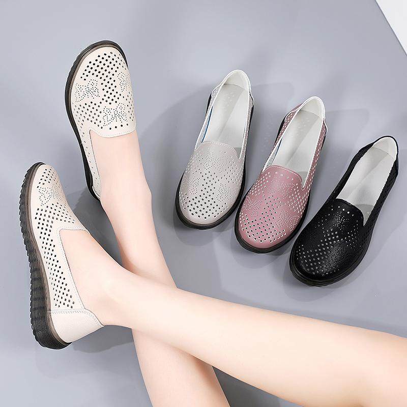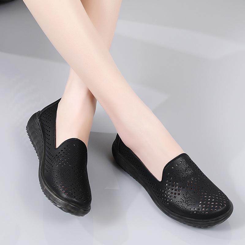 咪朵贝拉真皮豆豆鞋女软底夏季镂空凉鞋妈妈鞋中老年防滑单鞋