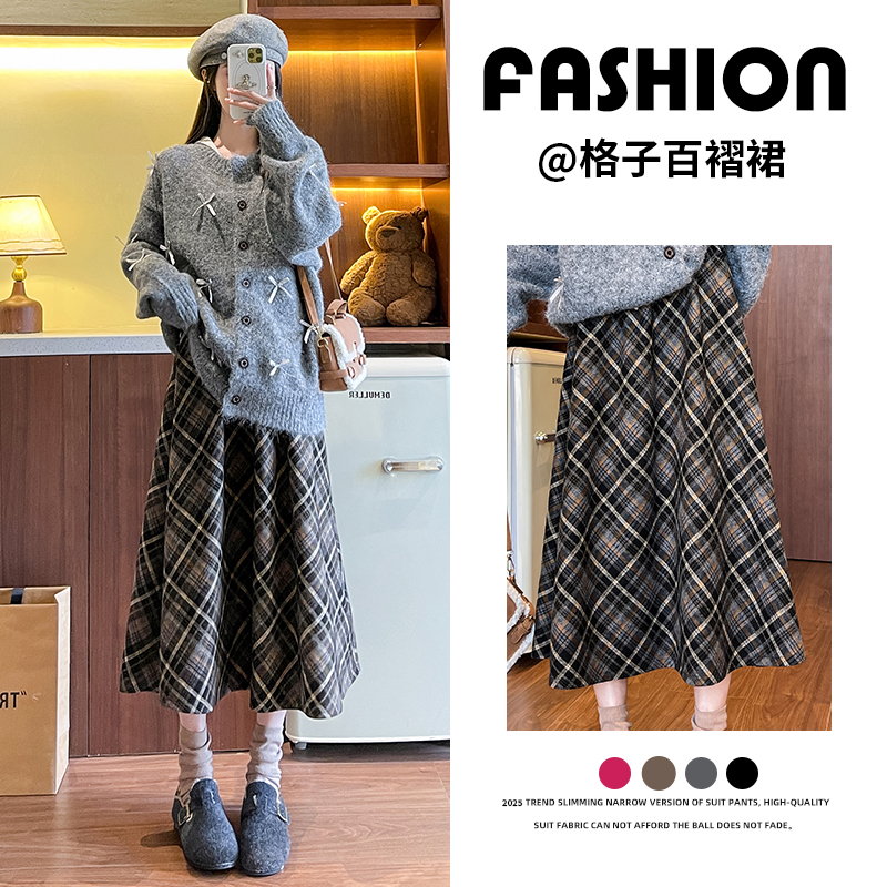 格子毛呢半身裙女秋季2025新款高腰复古格纹大摆裙中长款a字伞裙