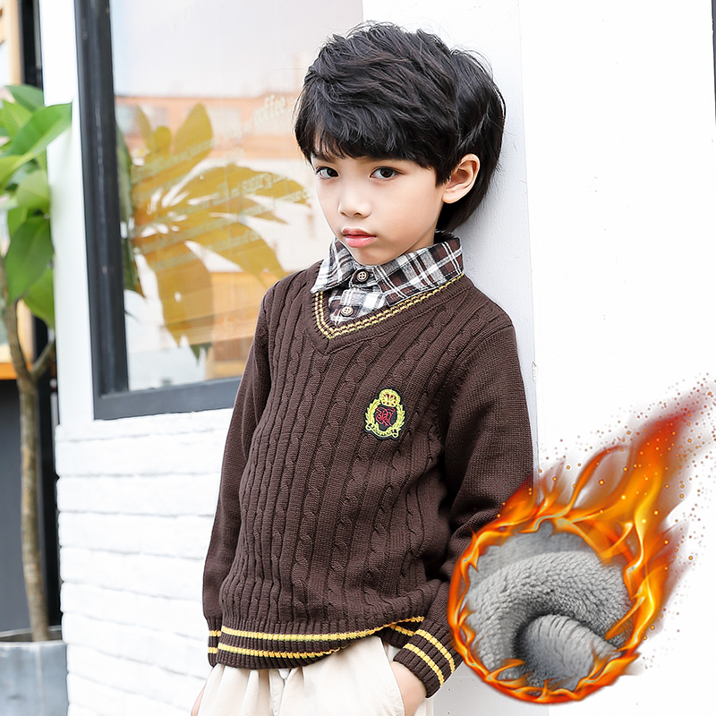假两件加绒加厚男童毛衣秋冬款保暖儿童上衣衬衫领针织衫翻领童装