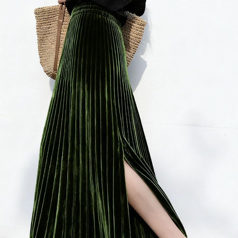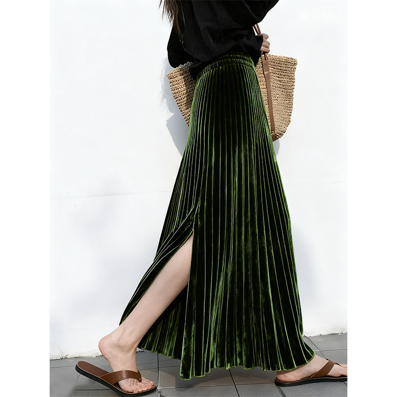冬天配大衣的裙子重要场合漂亮复古高腰绿色a字百褶丝绒半身裙女