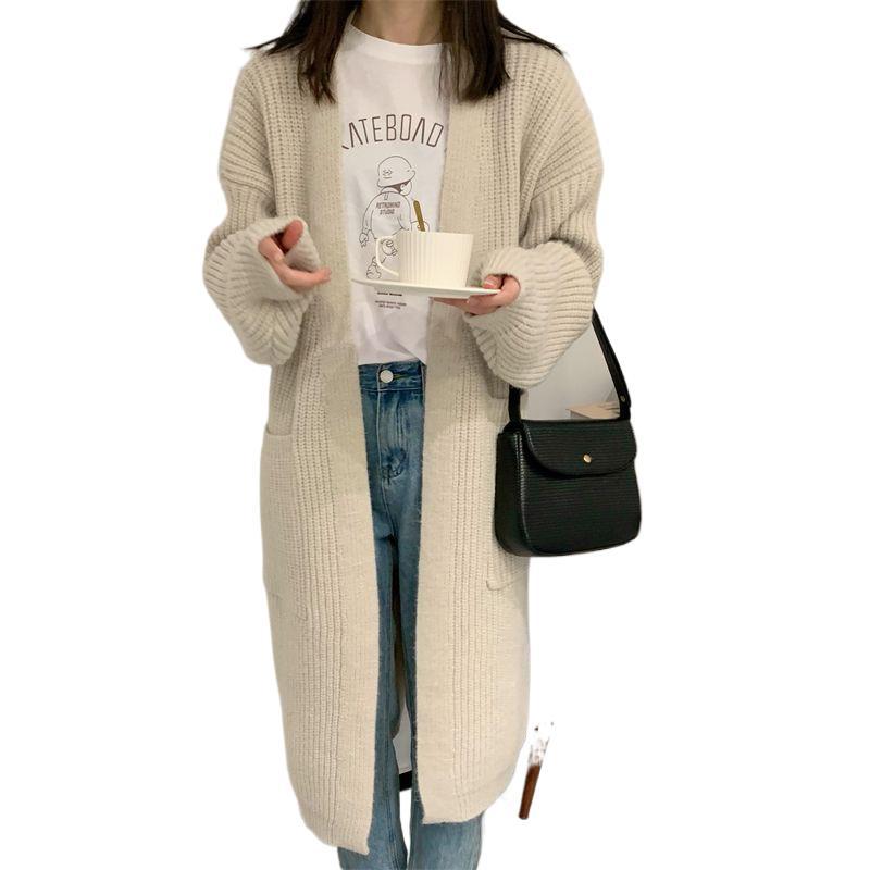 加厚粗毛线中长款针织开衫女 新品慵懒风大口袋宽松百搭外套