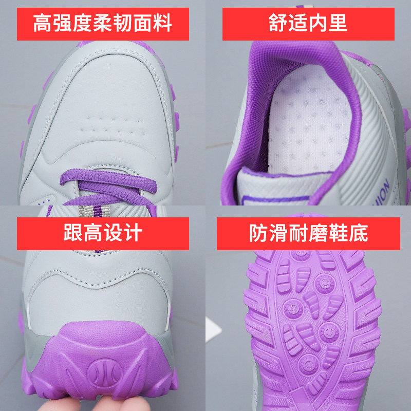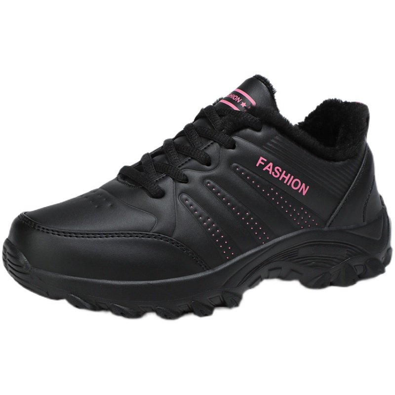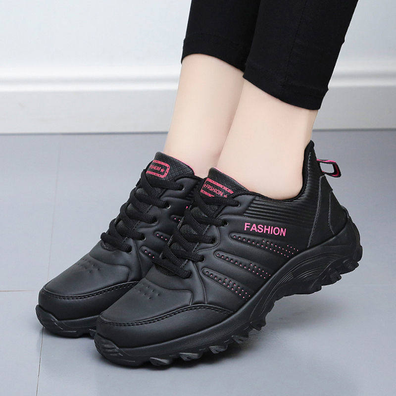 冬季新款女鞋黑色跑步运动鞋百搭轻便平底鞋皮面防水休闲旅游鞋女