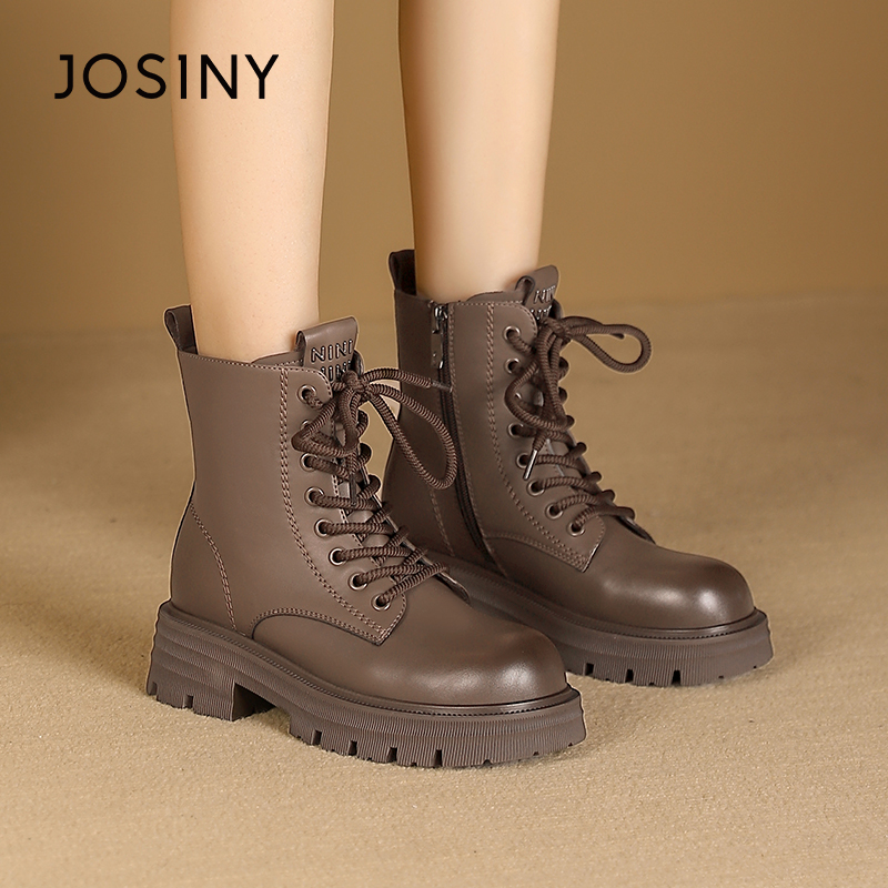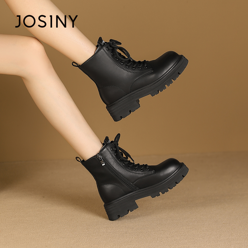 卓诗尼秋冬季撤柜正品女短筒靴圆头方跟金属字母装饰系带马丁靴