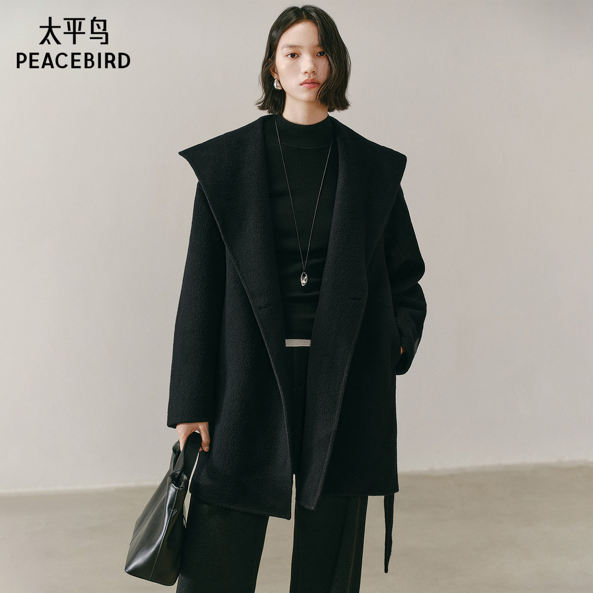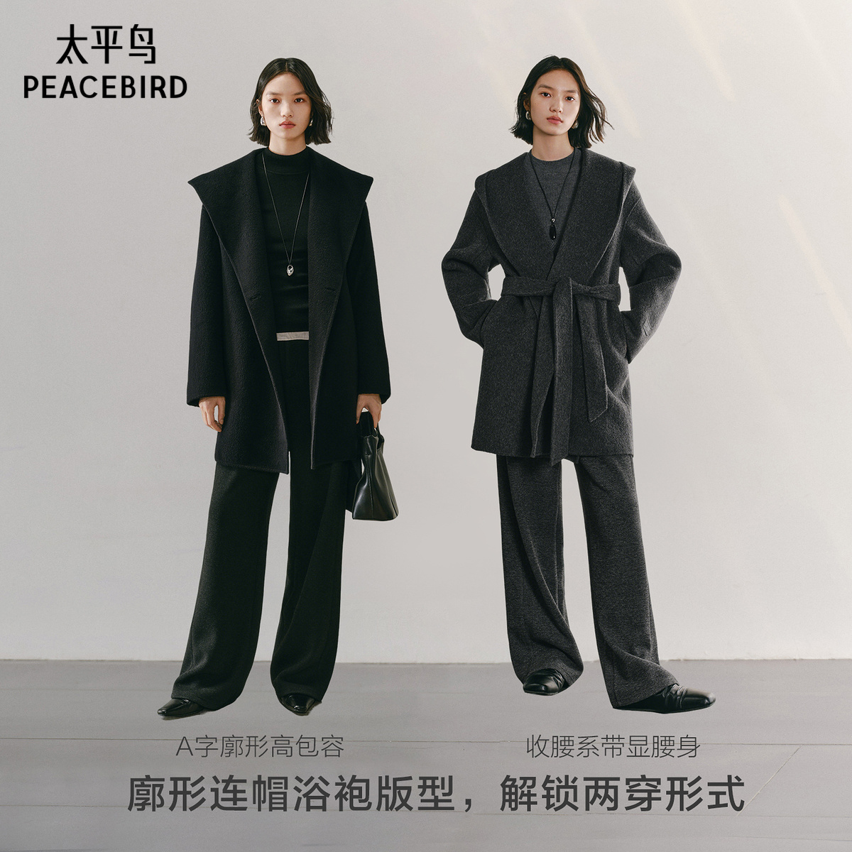 太平鸟甄绒系列智感斗篷大衣25新款连帽弯刀袖羊绒双面呢大衣女
