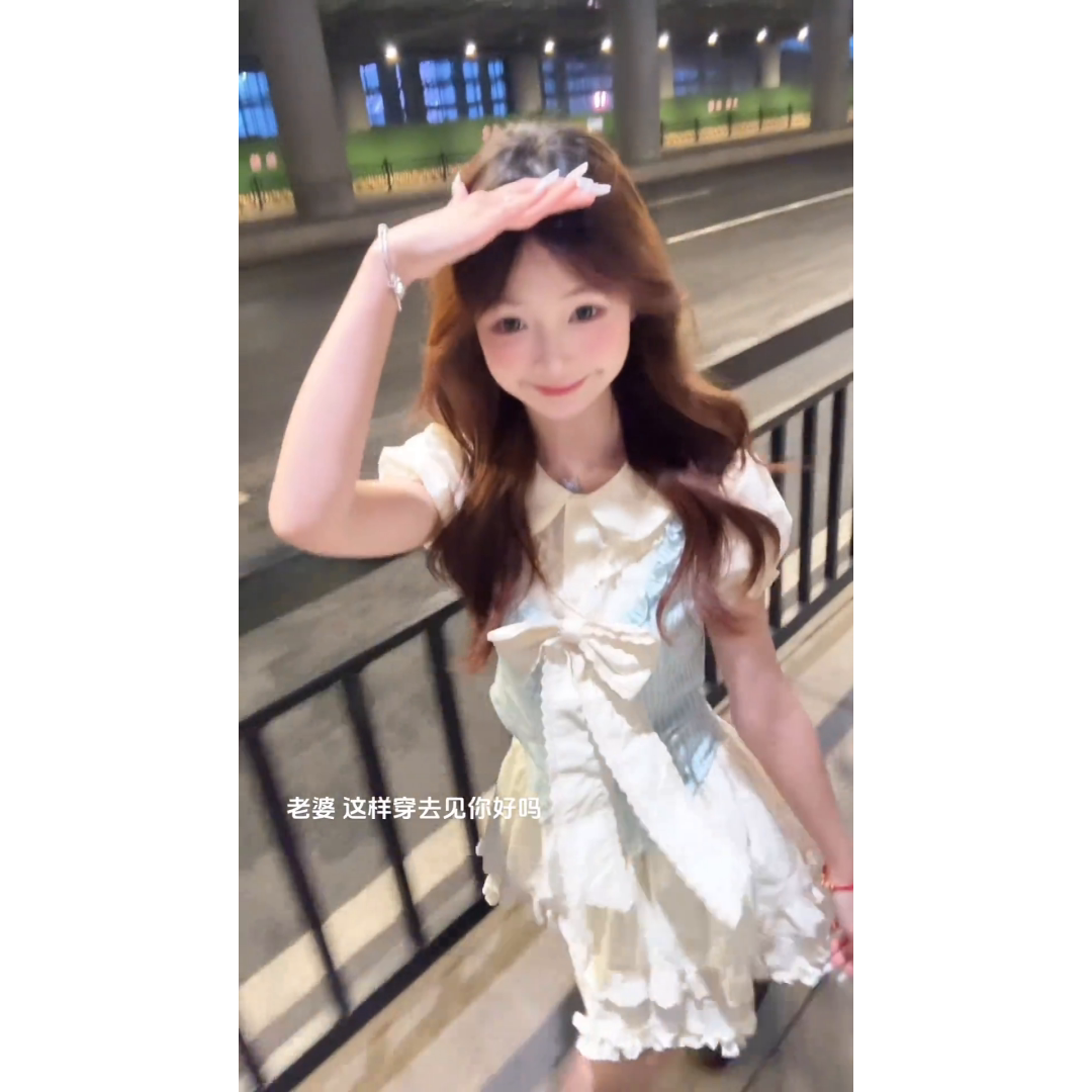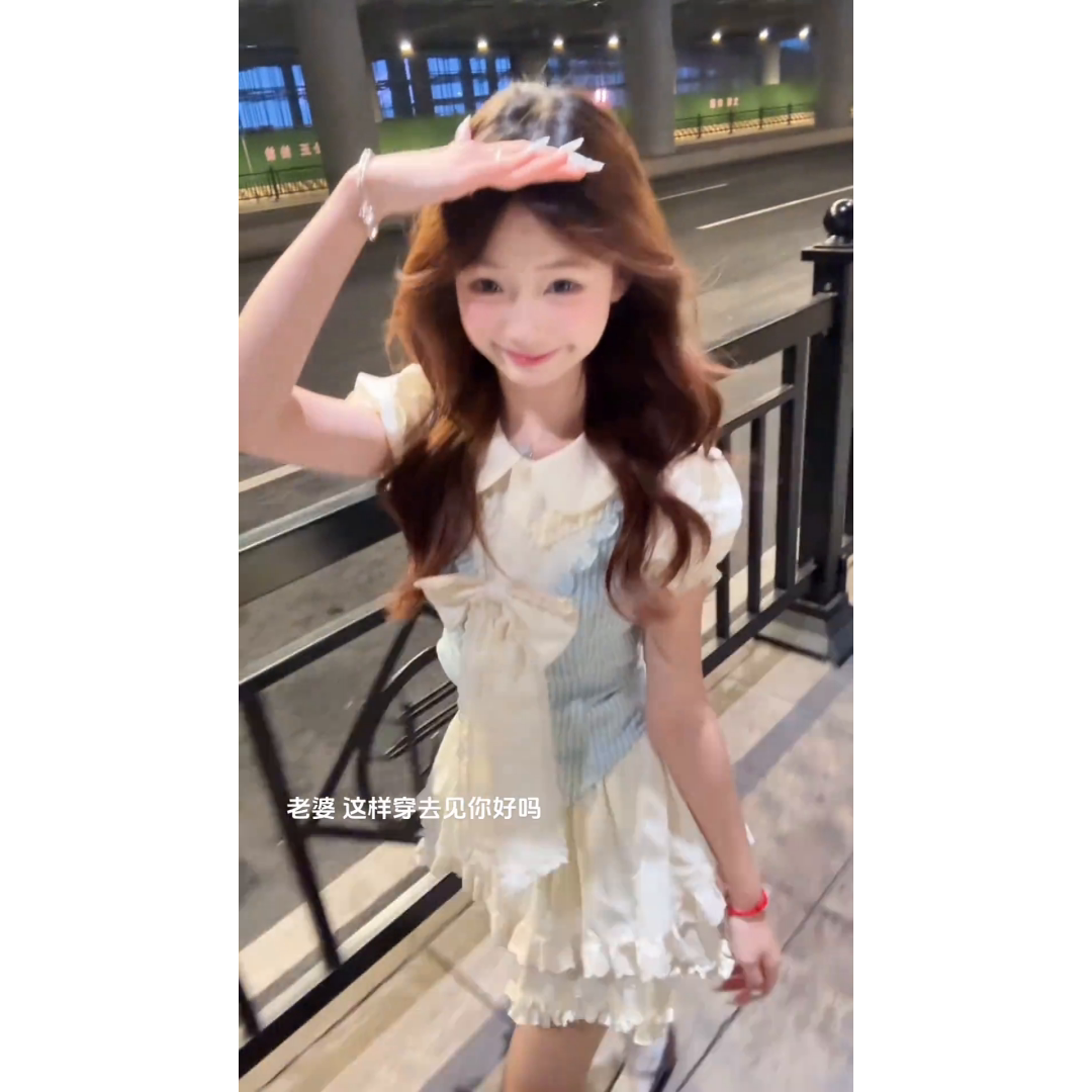 夏季新款蝴蝶结拼接褶皱花边上衣小个子蛋糕裙高腰半身裙两件套装