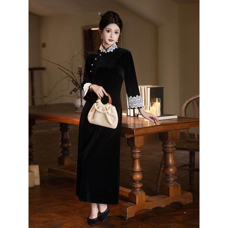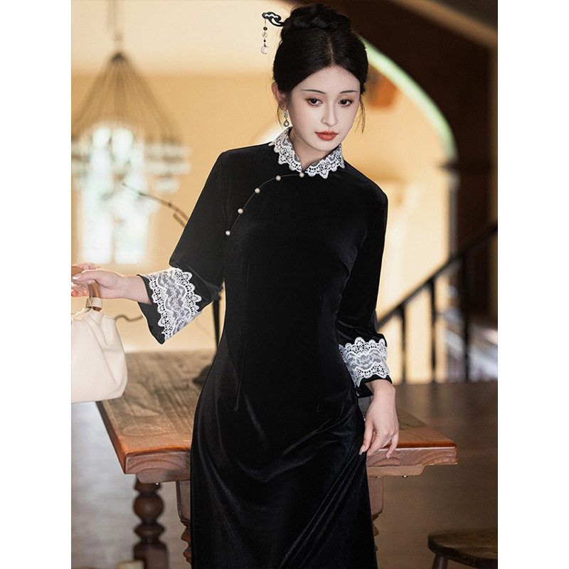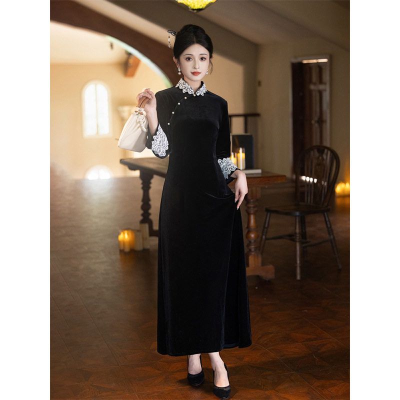 洛士丝绒改良新款黑色2024连衣裙新中式赫本秋冬女气质旗袍长袖高
