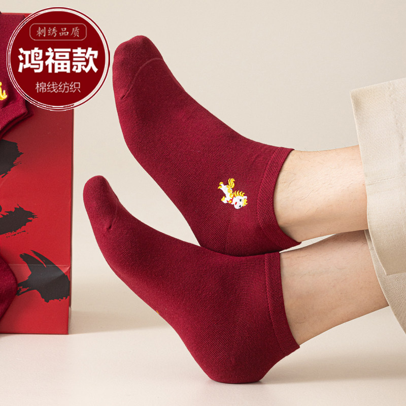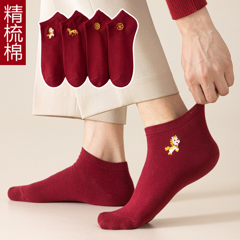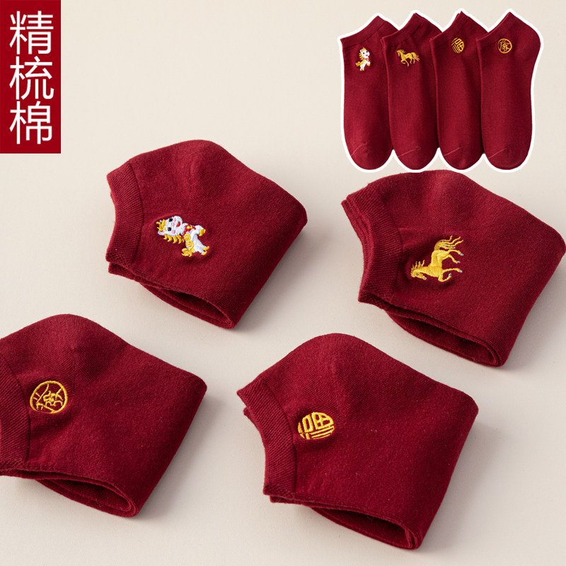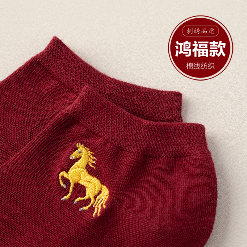 酒红色属马年船袜本命年男女一对喜字结婚情侣春夏薄款红袜子短袜