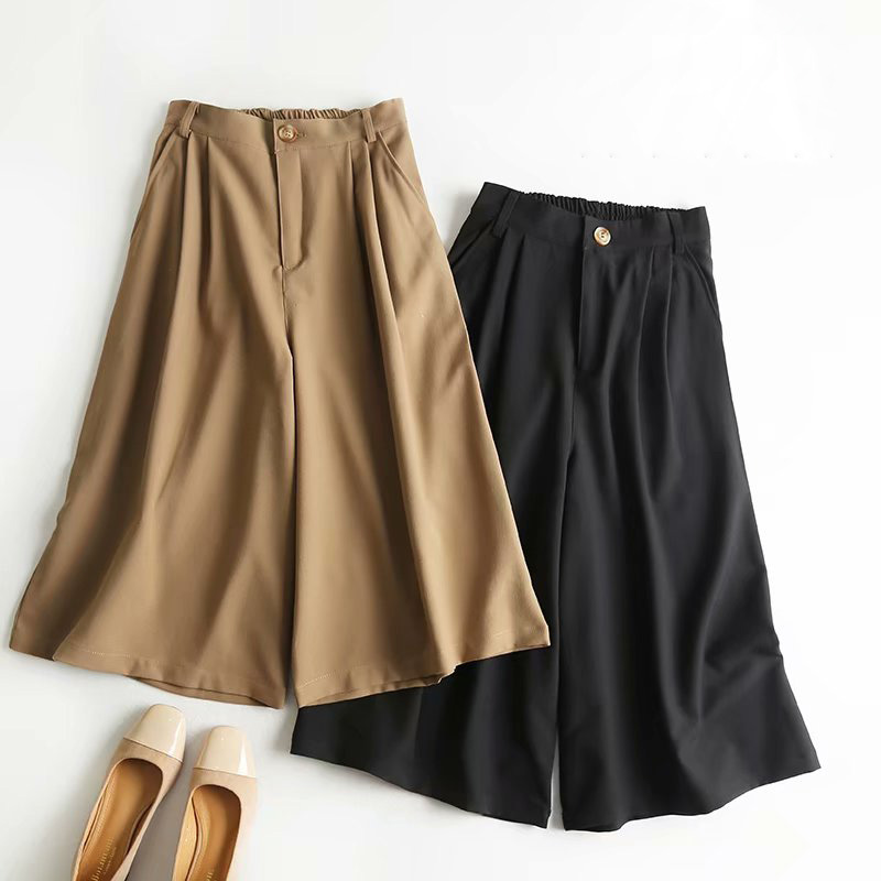 挺括行走带风の百搭一粒扣松紧高腰显瘦纯色阔腿裙裤休闲七分女裤