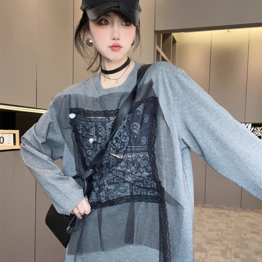 拼接蕾丝网纱长袖T恤女