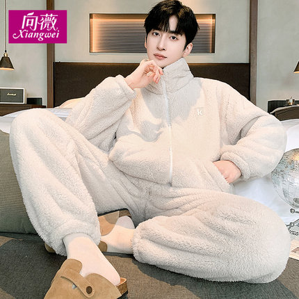 可外穿男大码宽松加绒加厚暖绒保暖家居服睡衣套装秋冬新款雪花绒