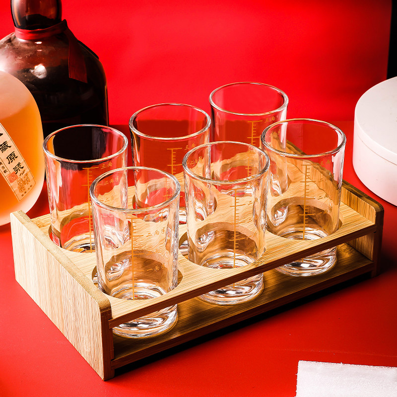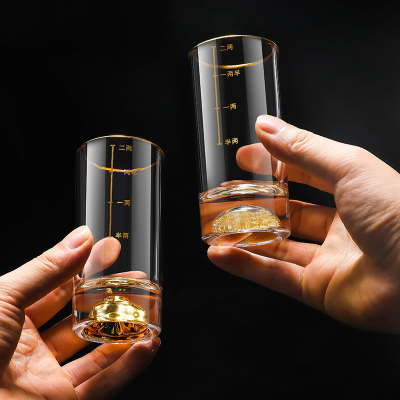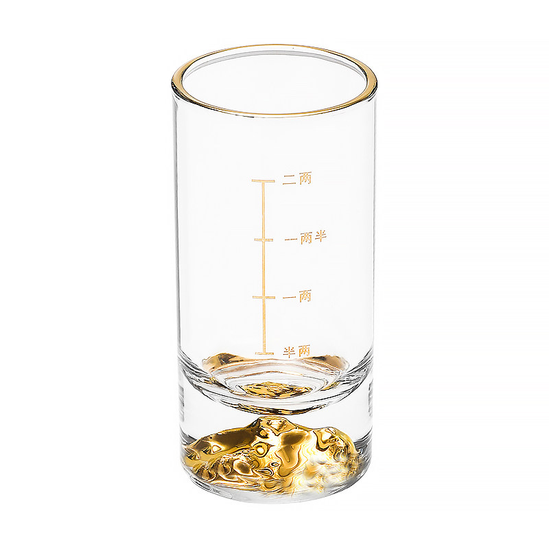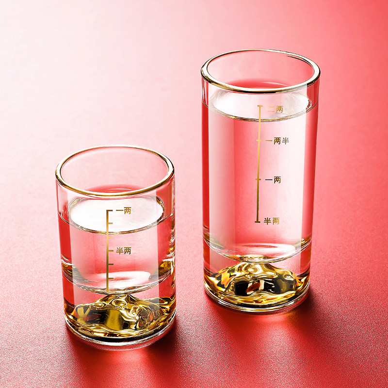 家用金山白酒杯高档刻度玻璃杯子100ml二两金箔烈酒杯小酒具套装
