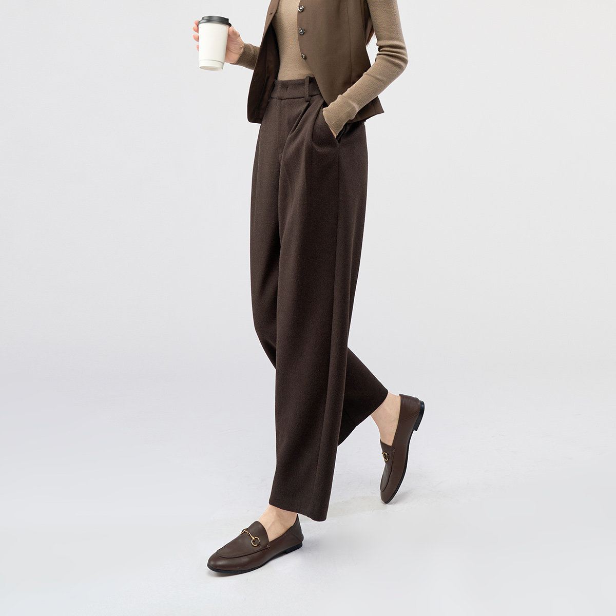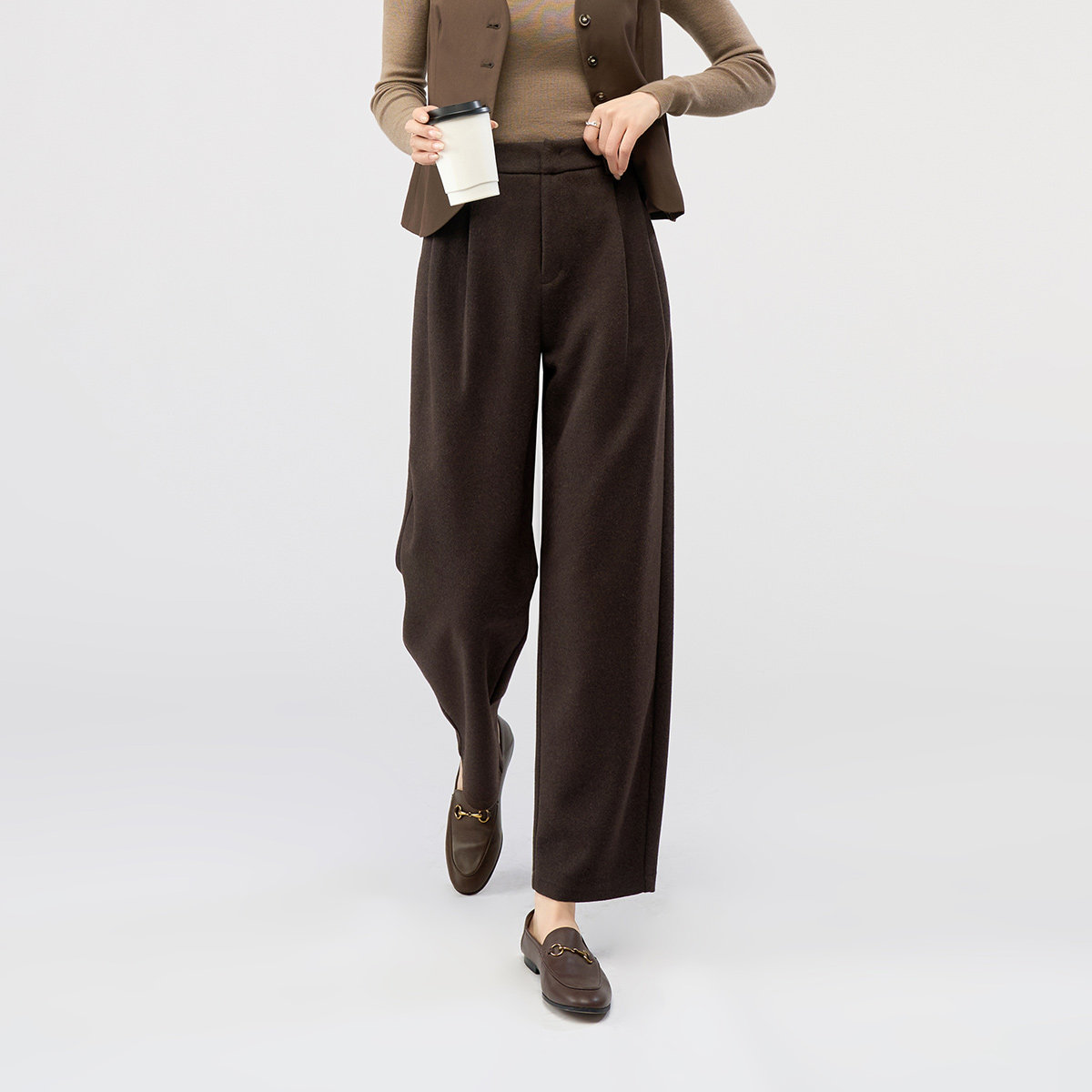 娅丽达羊毛糯米香蕉裤女2025秋冬新款休闲直筒九分裤棕色毛呢裤子
