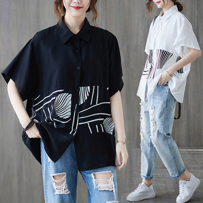 短袖衬衫T恤女夏装新款宽松大码显瘦印花遮肉减龄胖人mm女士衬衣