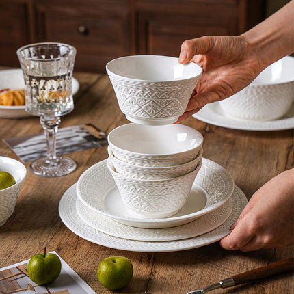 舍里白色浮雕餐具陶瓷米饭碗组合家用2025新款汤碗西餐盘菜盘鱼盘