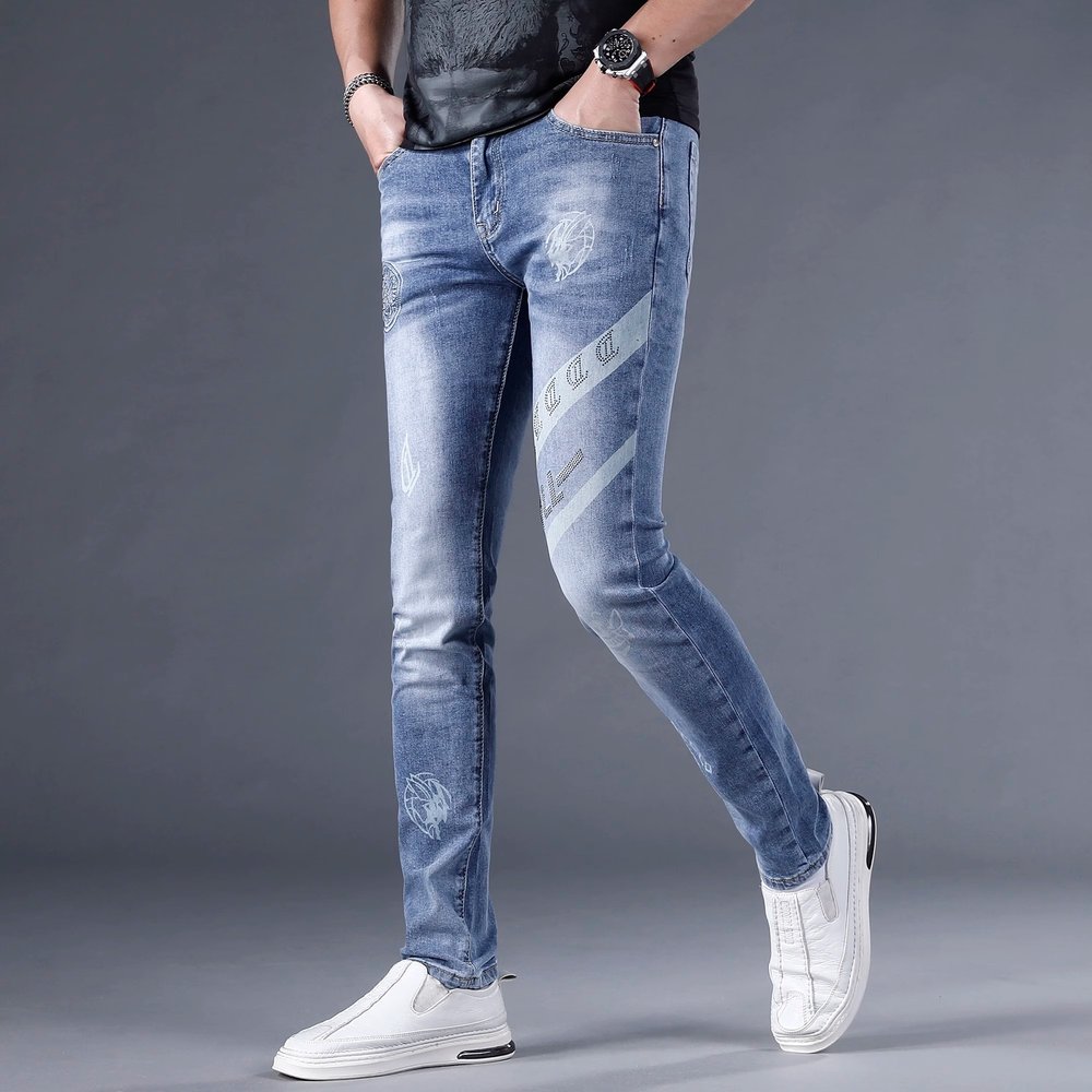 印花裤子男潮牌春季新款修身九分小脚裤紧身牛仔裤精神小伙九分裤