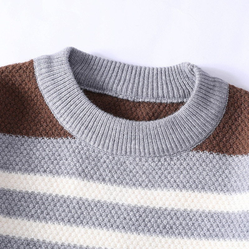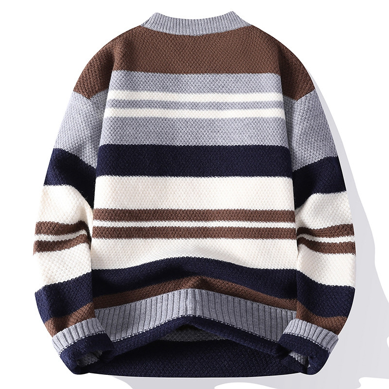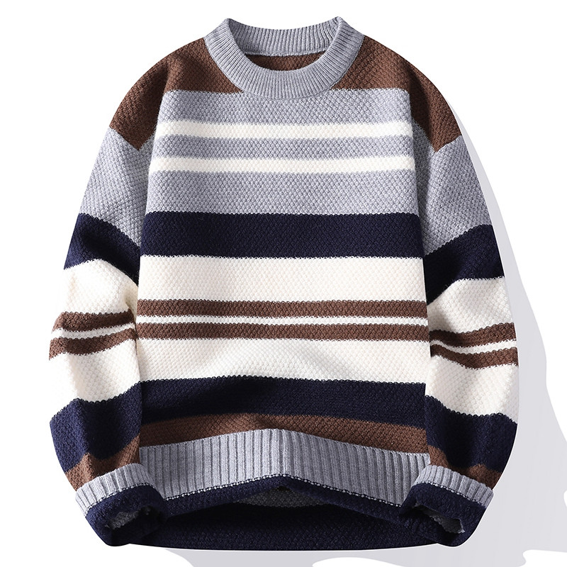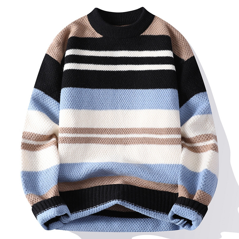 秋冬新款撞色条纹加厚圆领套头毛衣男士潮流休闲打底针织衫修身