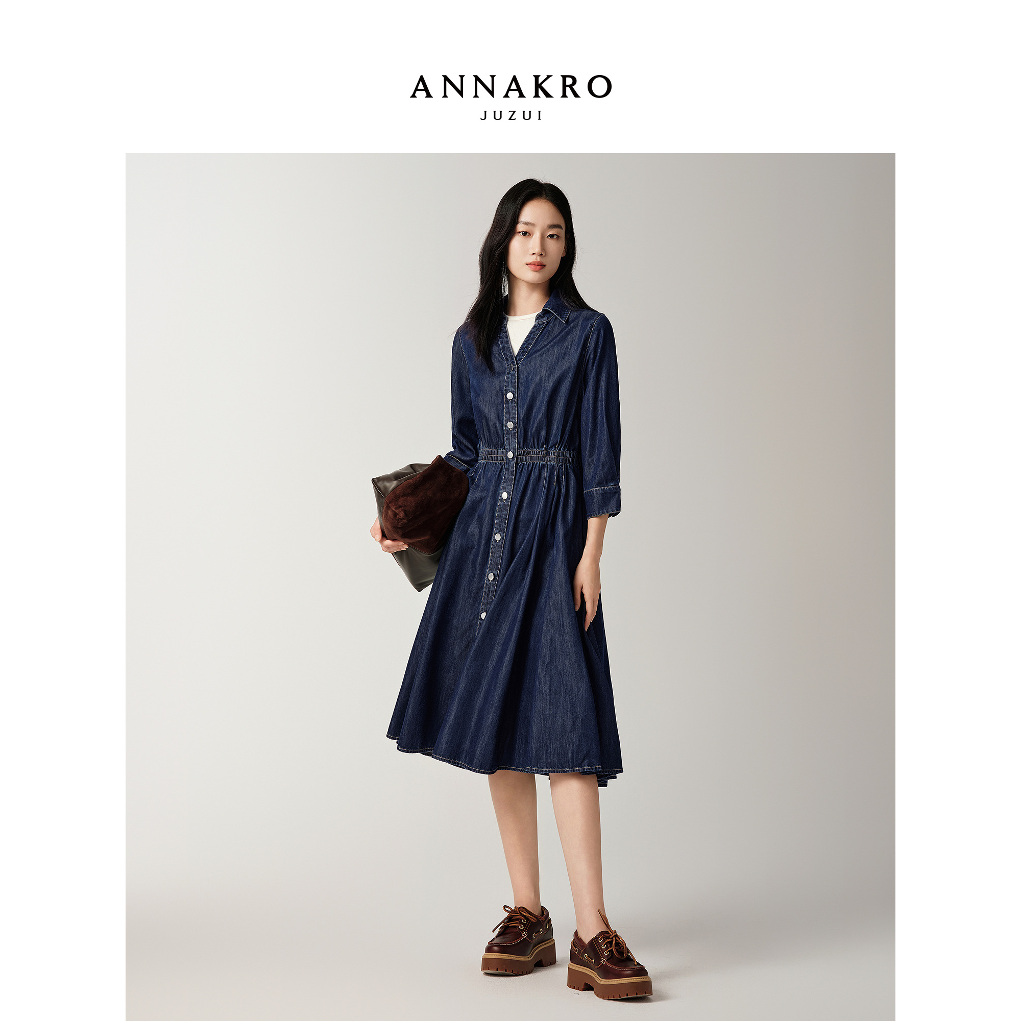 玖姿安娜蔻复古文艺通勤风莱赛尔收腰衬衫式连衣裙女2025秋季新款