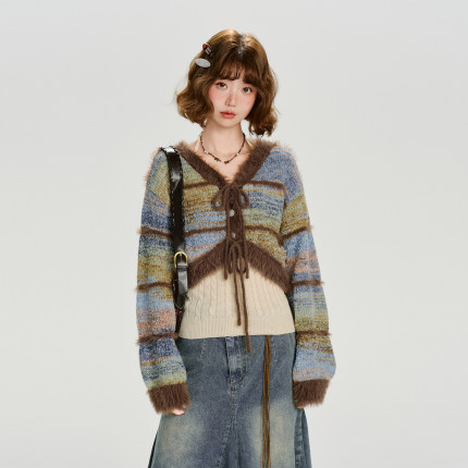 Girlyhalo美式复古辣妹撞色针织开衫女秋季新款设计感短款外套
