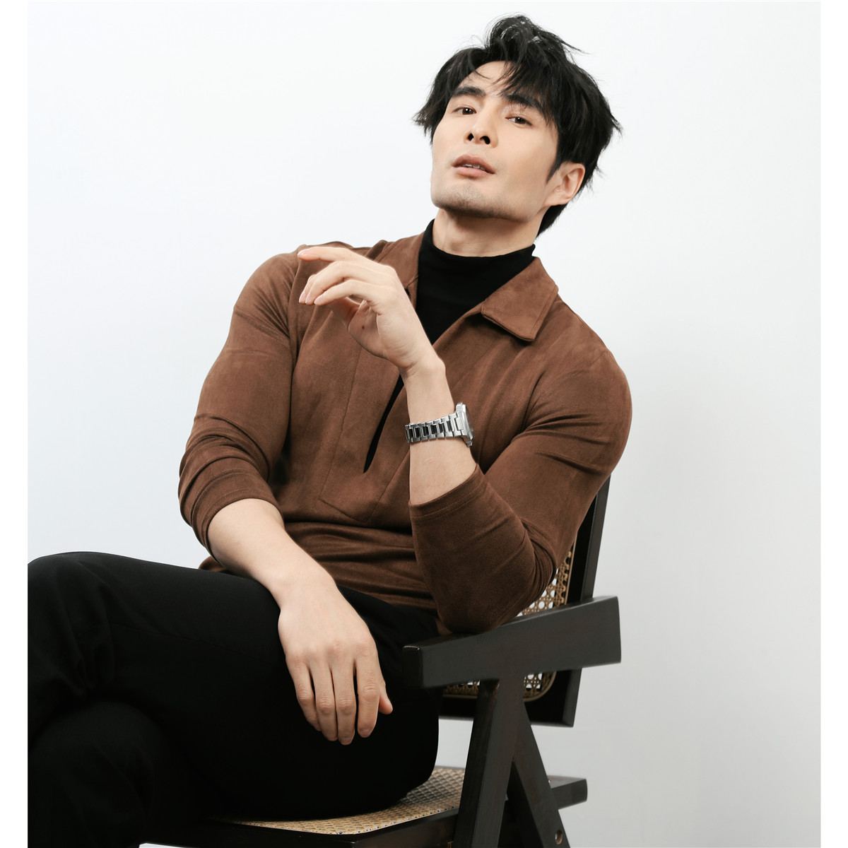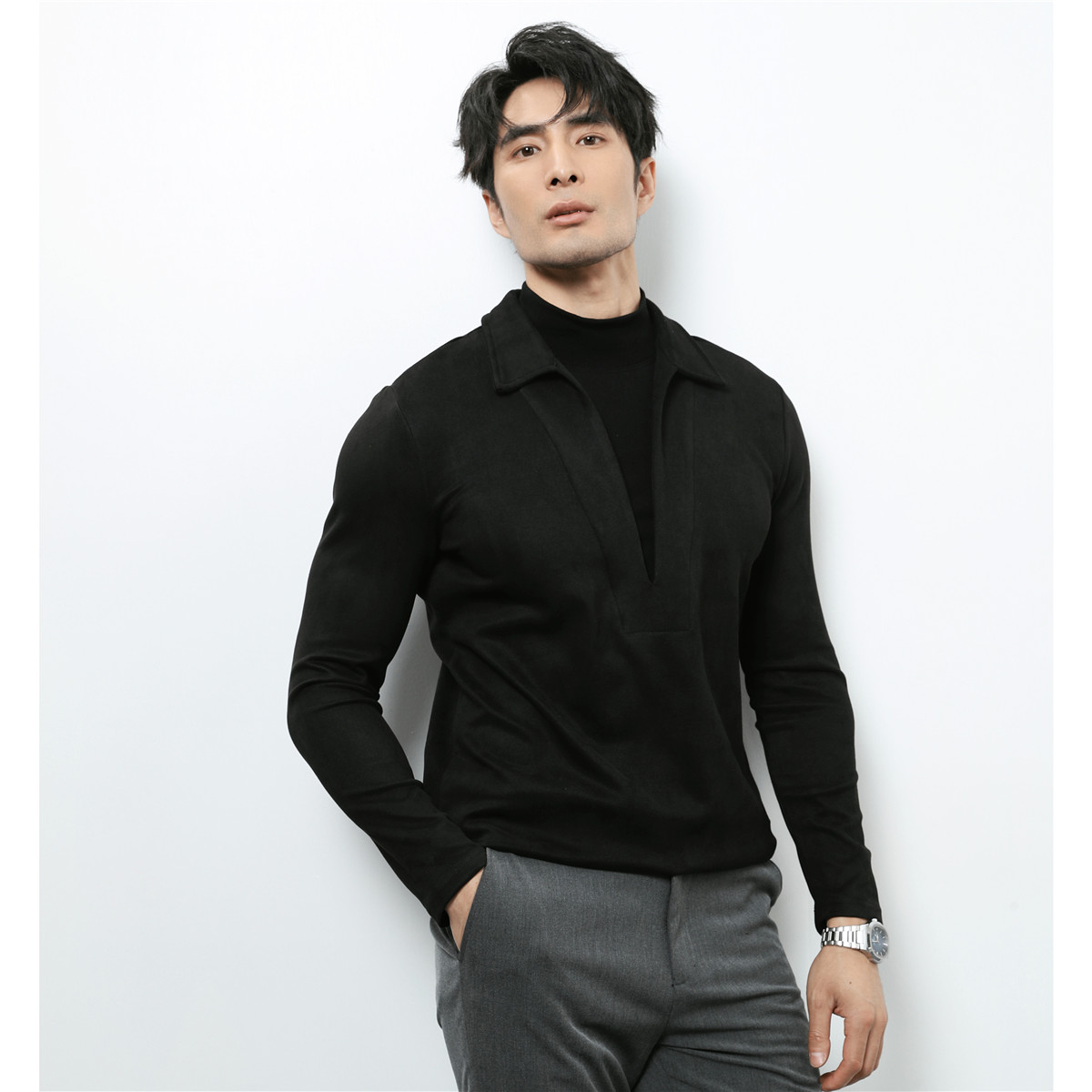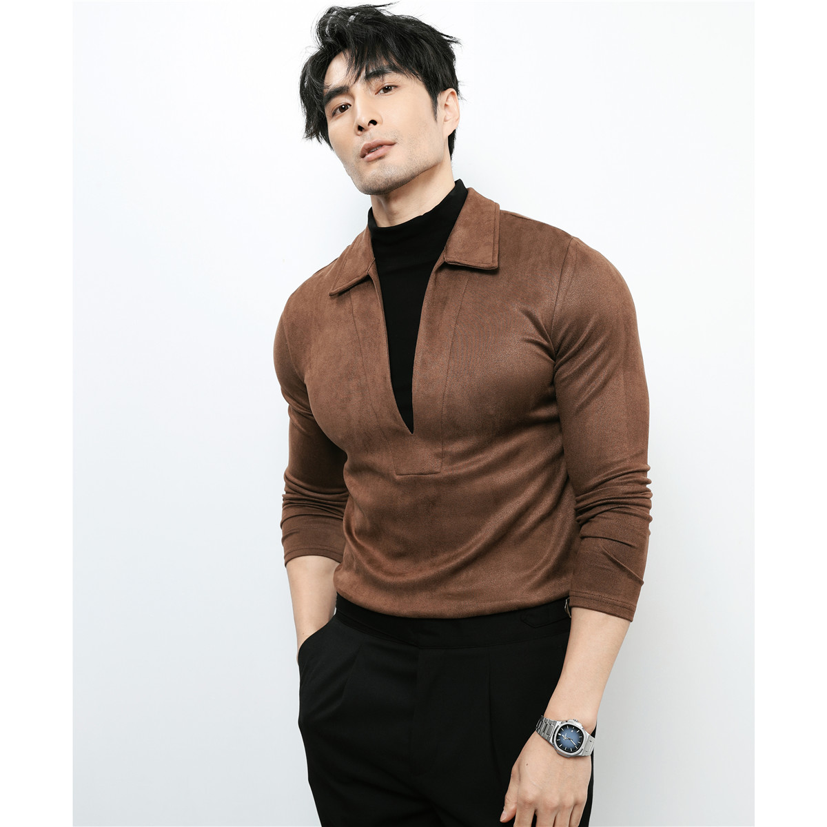 高级感复古鹿皮绒假两件免烫衬衫男垂感轻奢纯色修身中领长袖衬衣