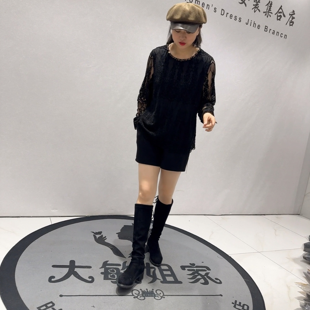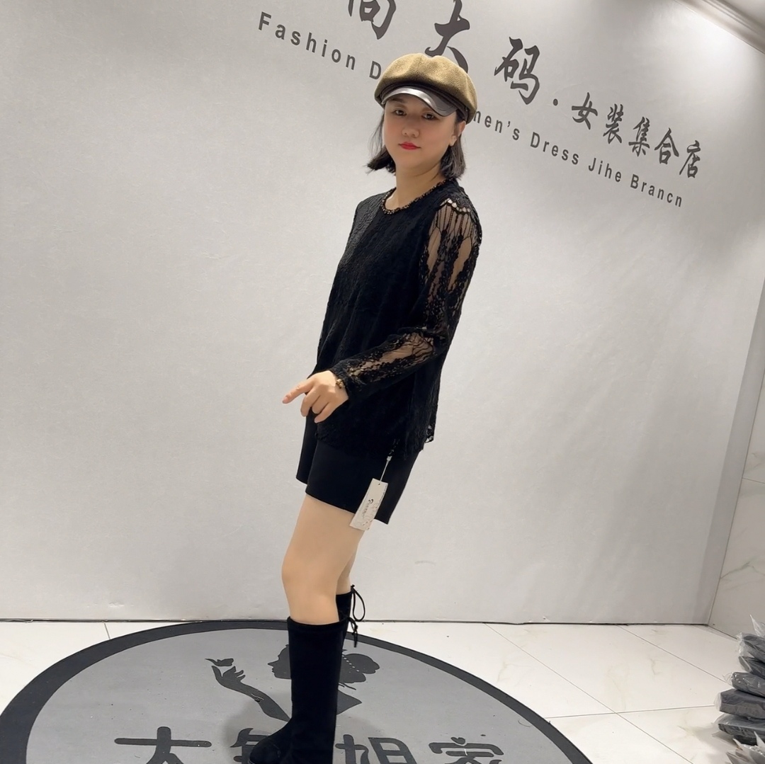 8260女权贵族初冬新品女人味单层袖植绒拼接蕾丝面料气质衫加大码