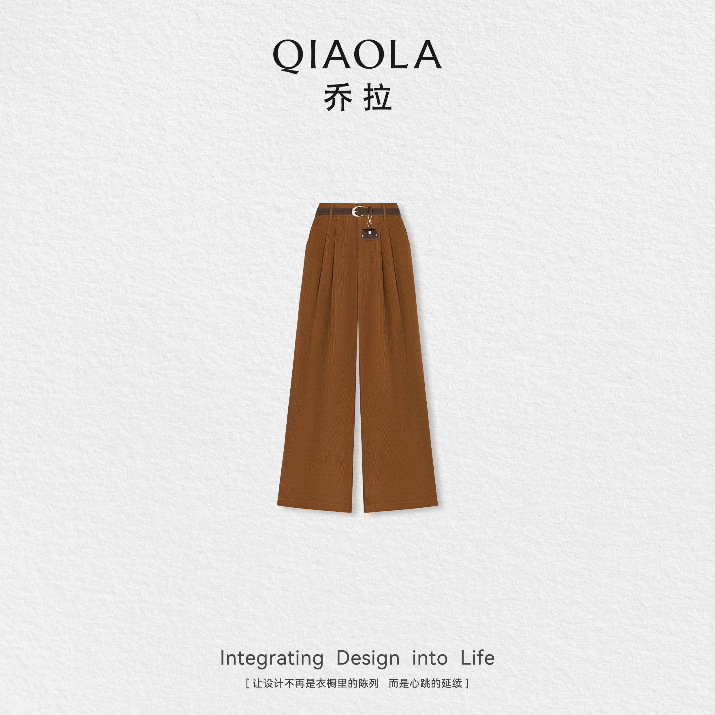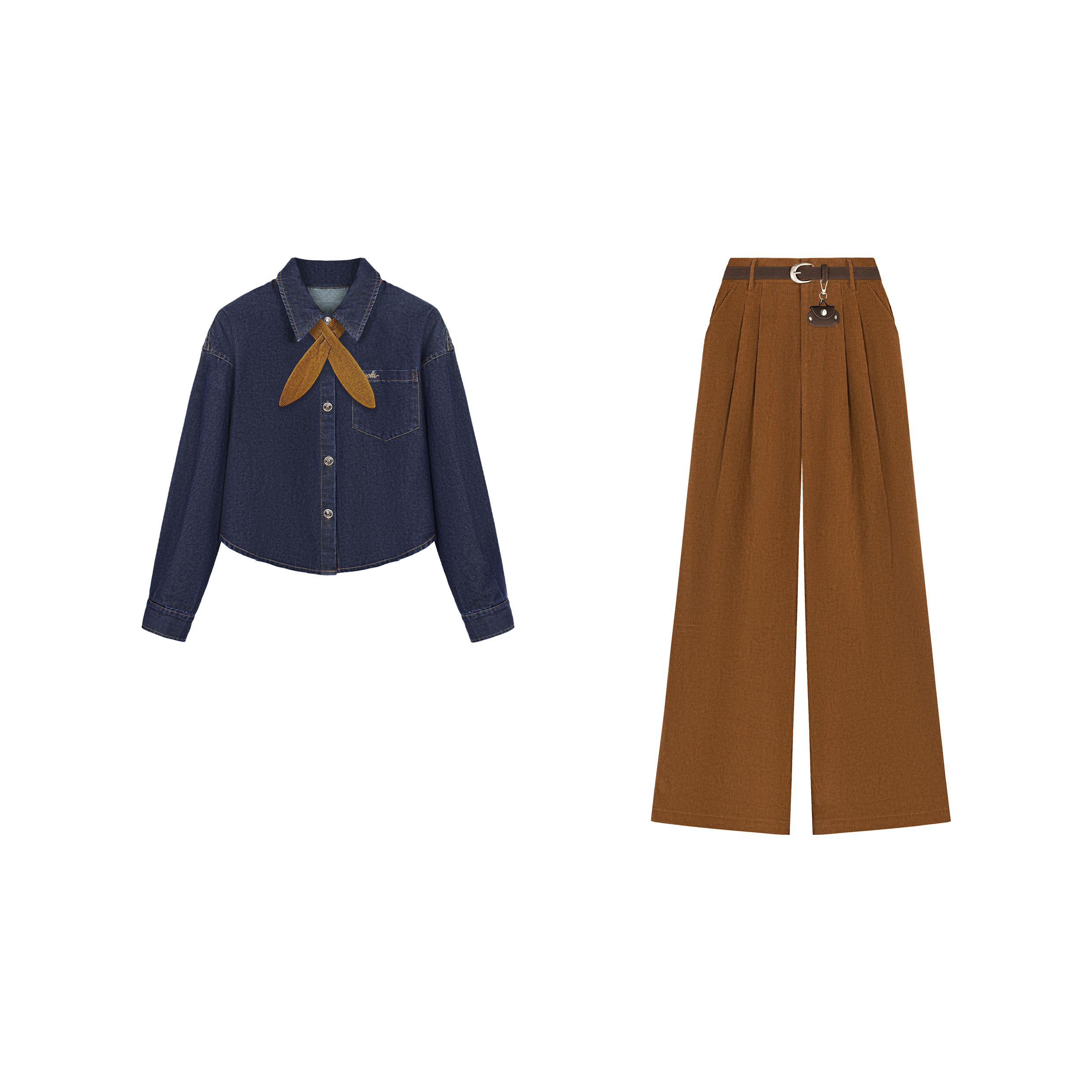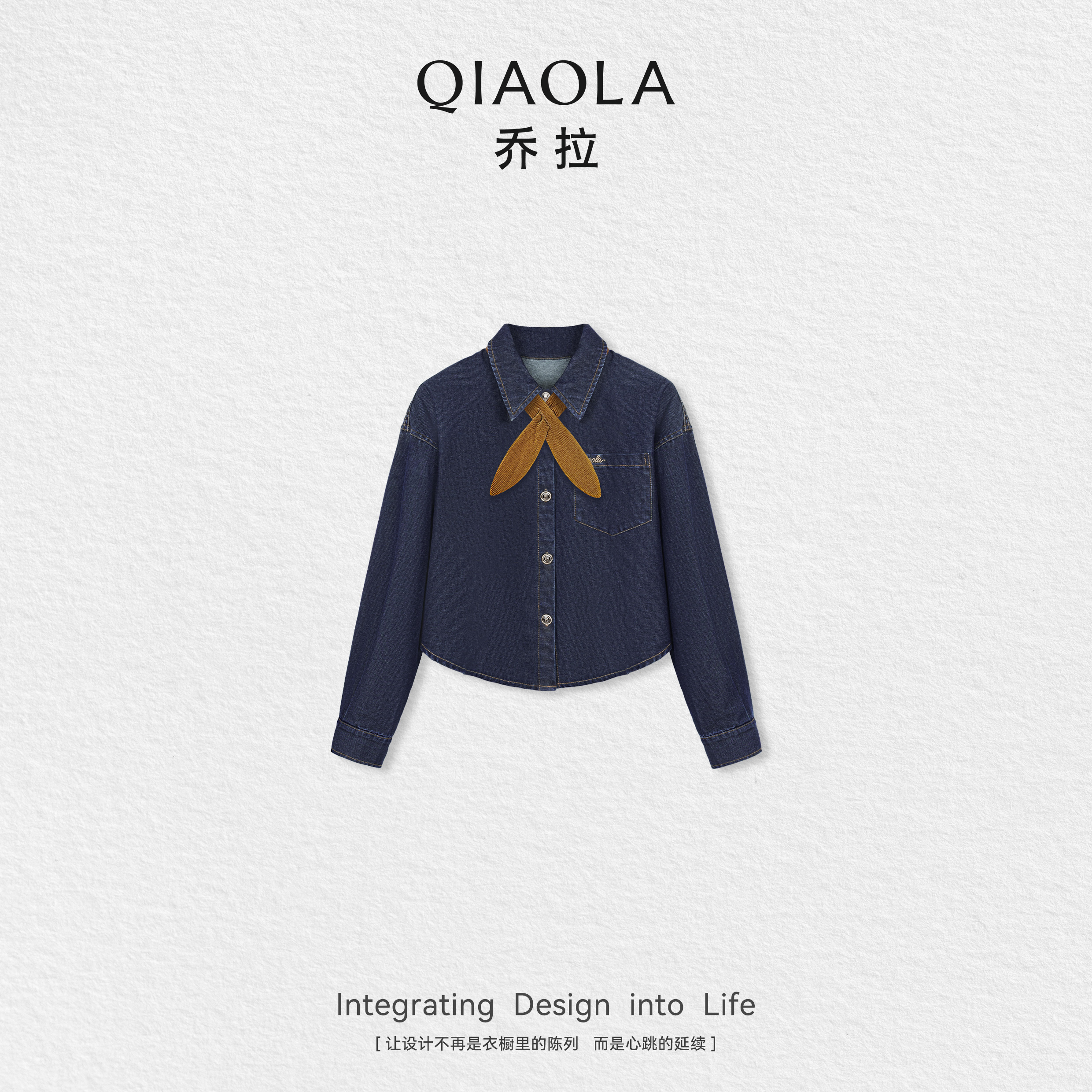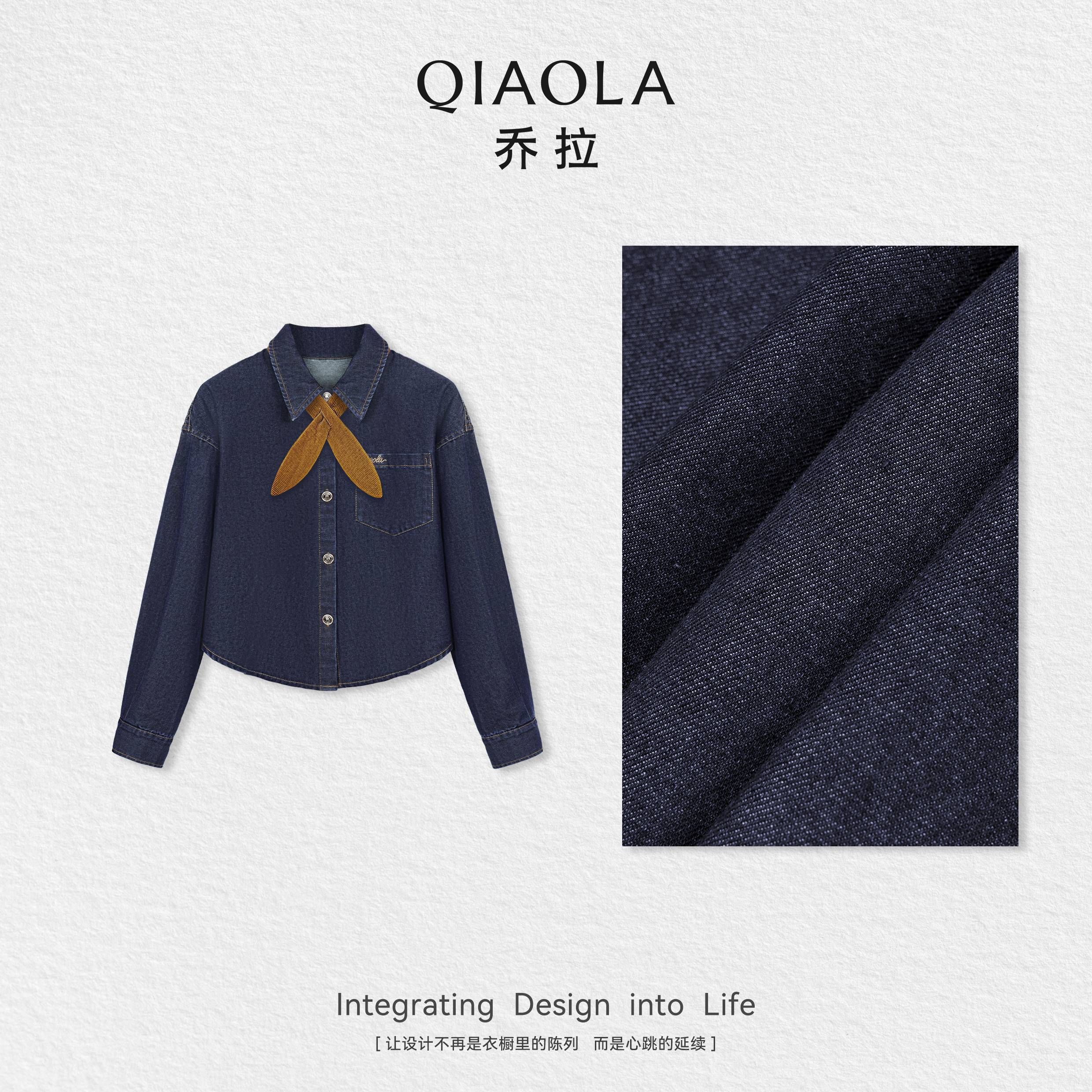 乔拉【焦糖榛果】秋季新款蓝色牛仔翻领丝巾衬衫条纹阔腿裤套装女