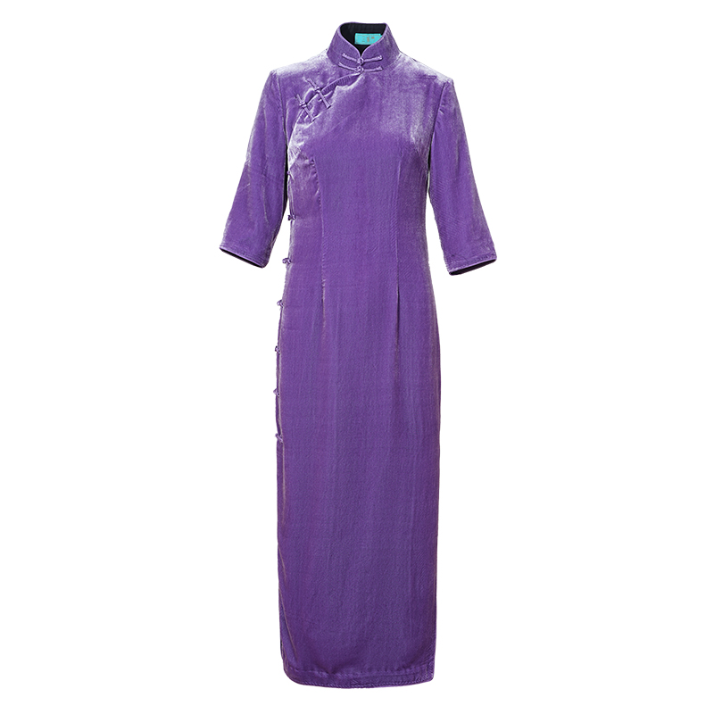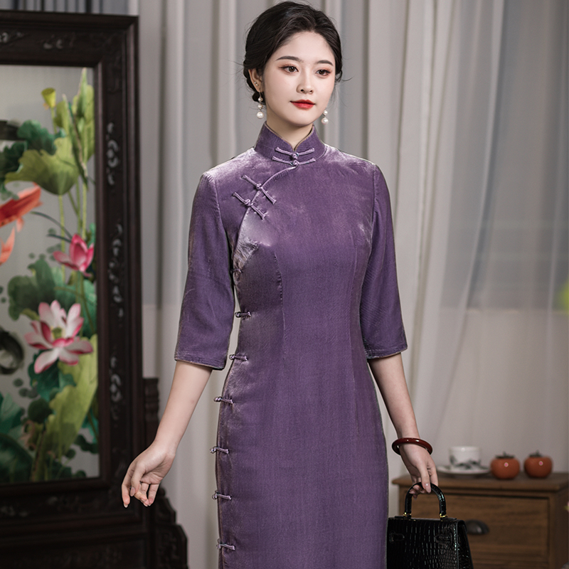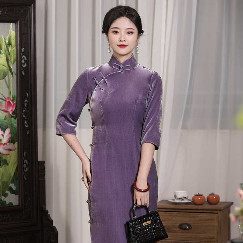 回忆曲三重门2025年新款真丝绒桑蚕丝手工长旗袍修身复古气质国风