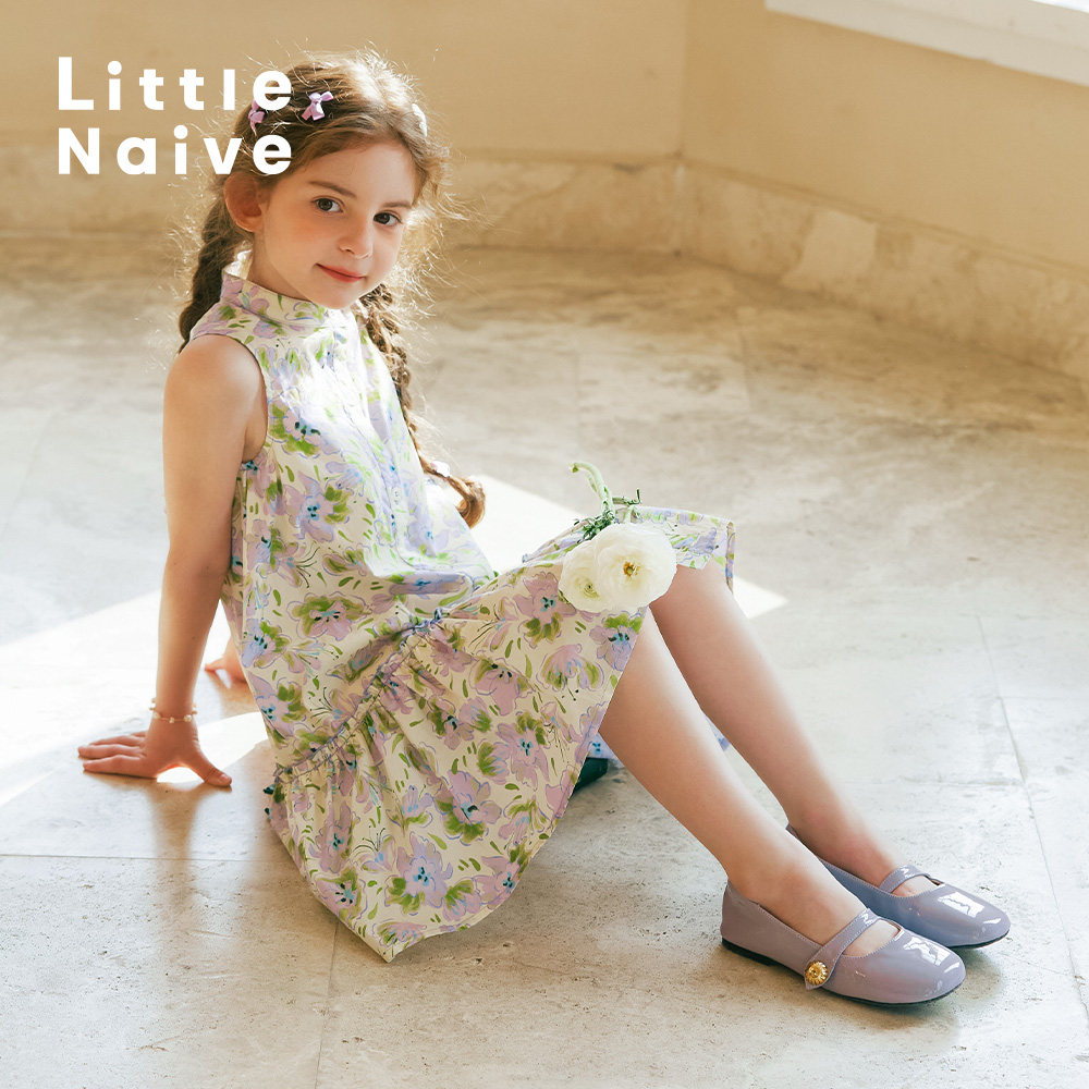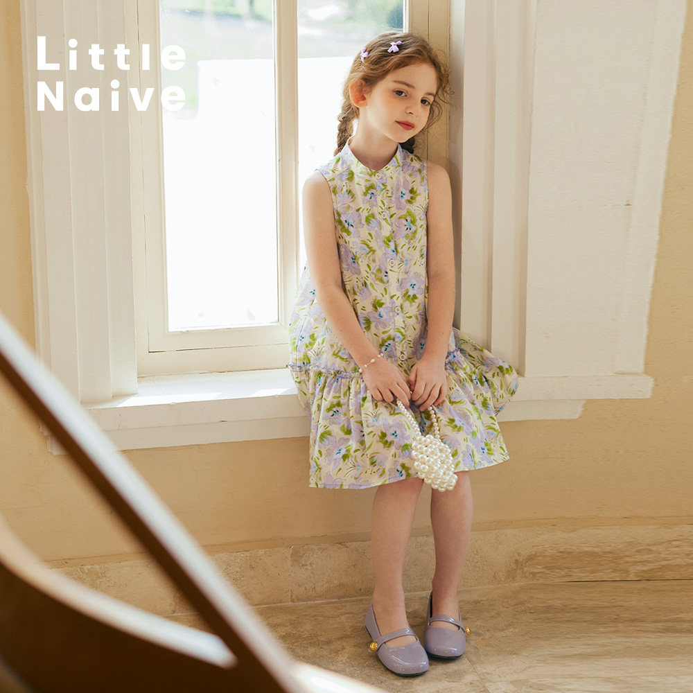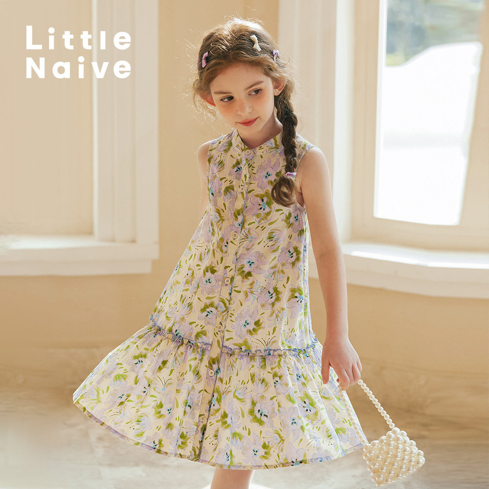 LittleNaive连衣裙女童夏季纯棉无袖甜美衬衫裙儿童立领碎花裙