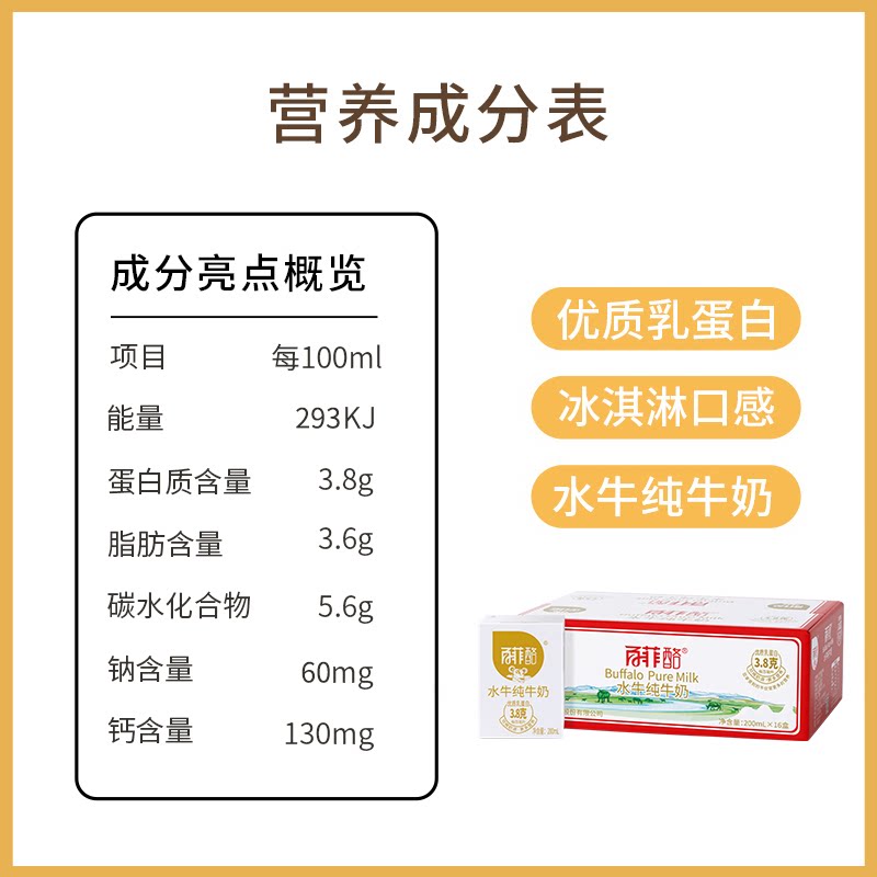 百菲酪水牛纯牛奶200ml*16盒/箱3.8g乳蛋白