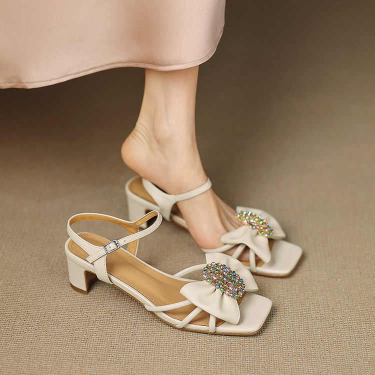 2025新款牛皮蝴蝶结方头一字带凉鞋女夏季外穿时尚中跟粗跟高级感