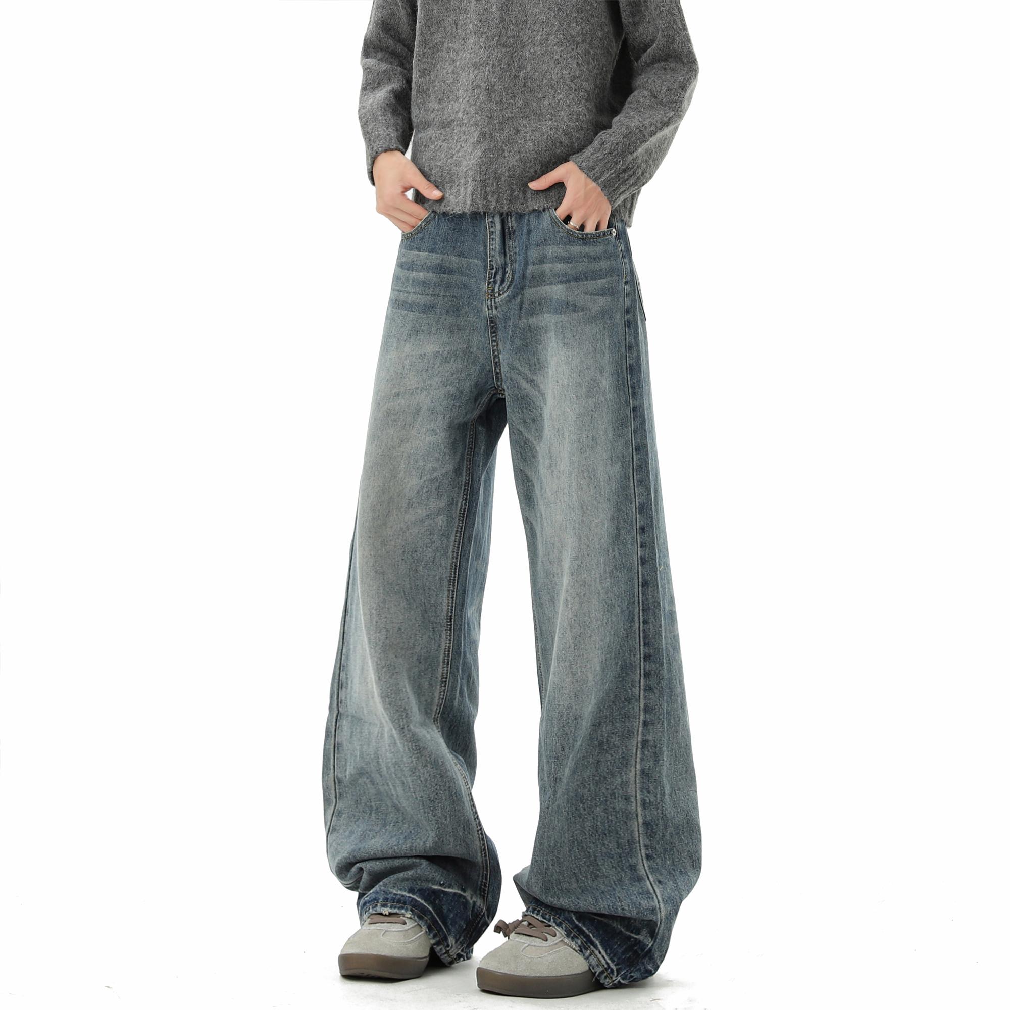 美式水洗做旧直筒牛仔裤男秋季潮牌高街宽松青少年阔腿弯刀长裤子