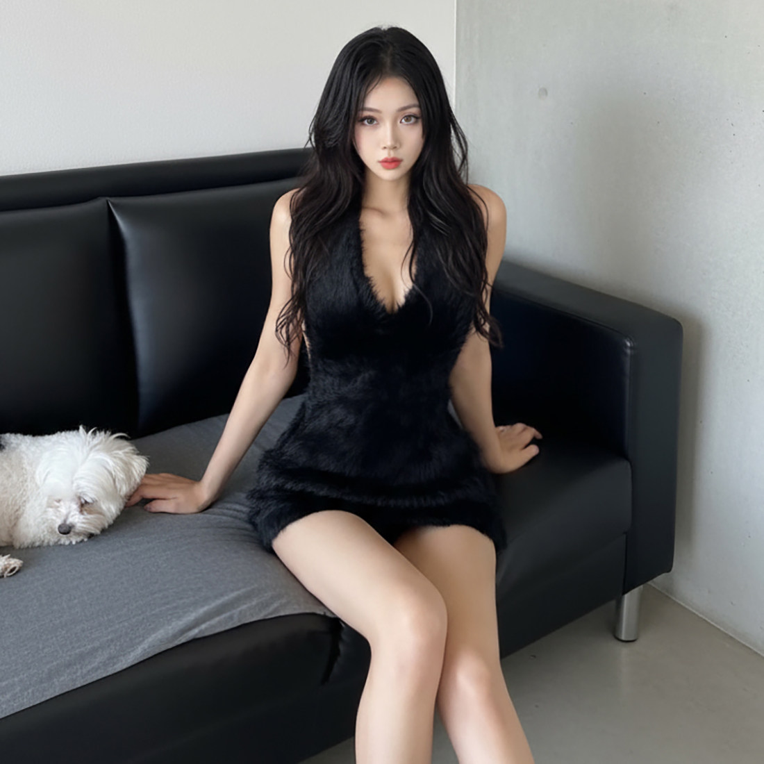 SylCue 名媛千金辣妹风毛毛深V领挂脖吊带连衣裙收腰百搭包臀裙女