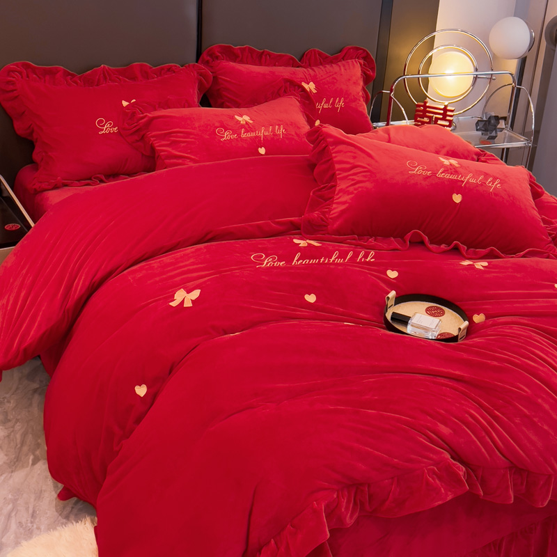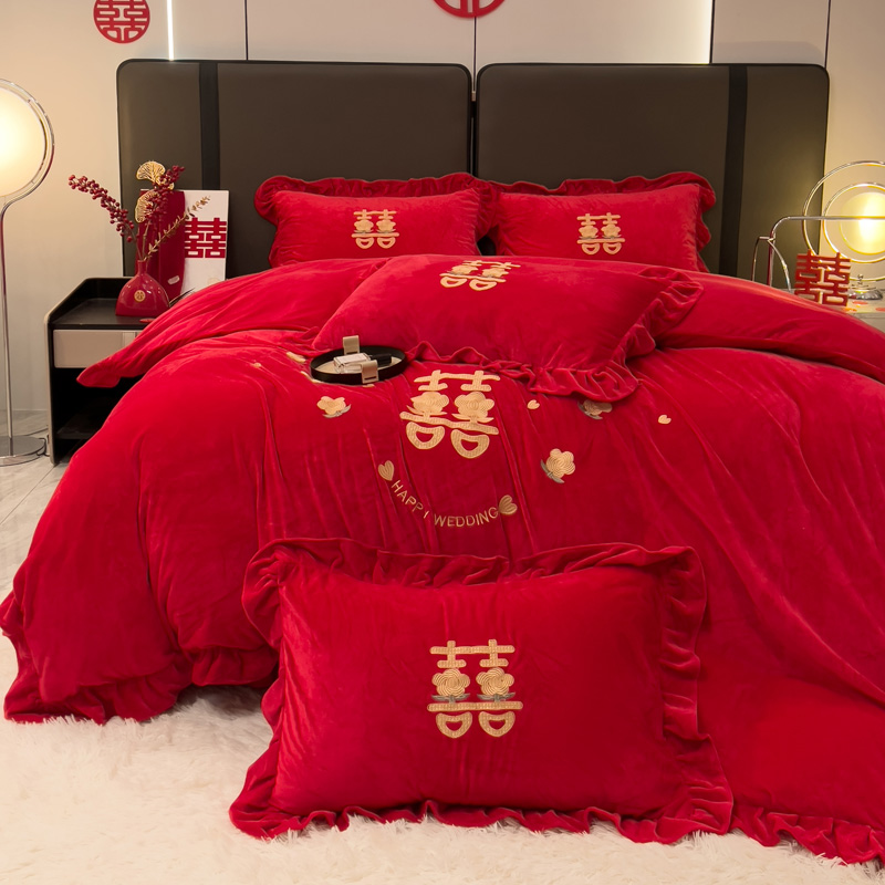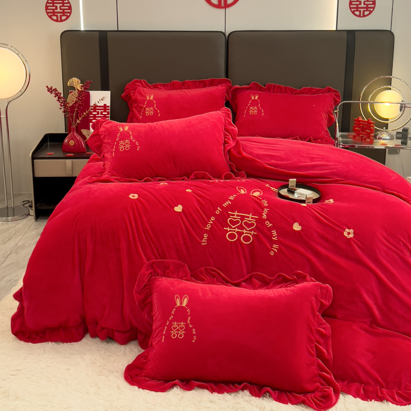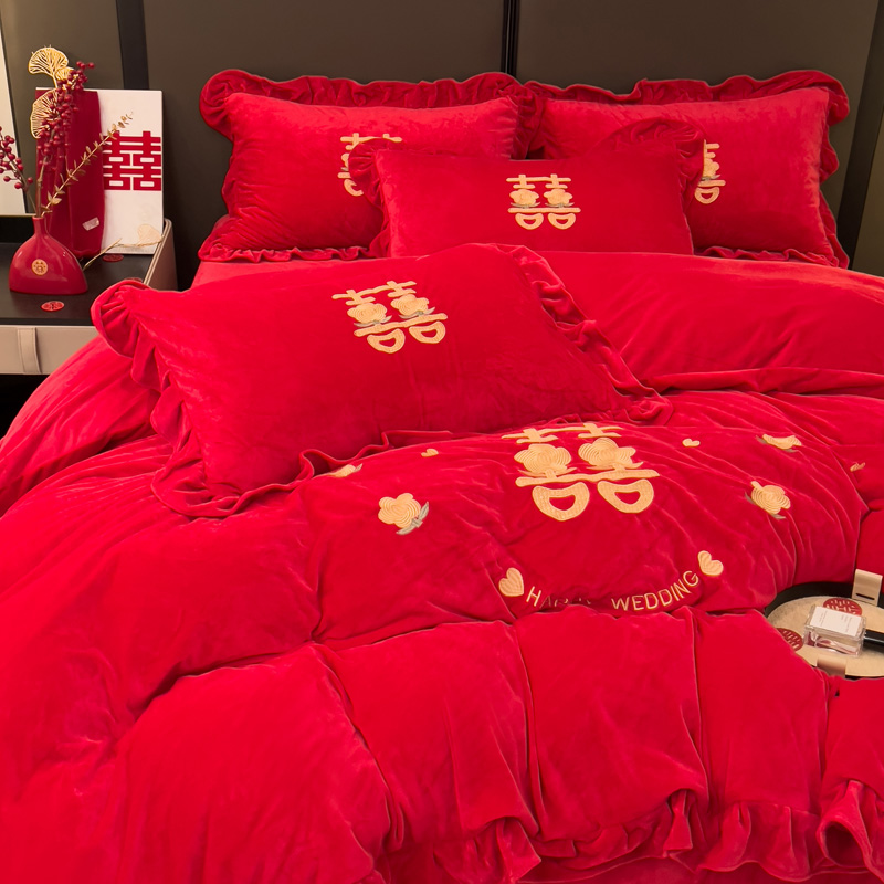宝宝绒婚庆四件套大红喜庆被套冬季加厚牛奶绒新结婚房法兰绒床单