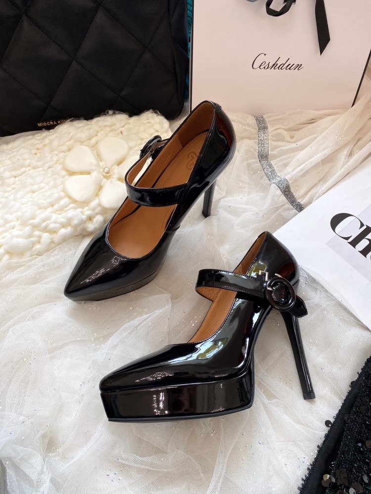 2024年新款浅口单鞋漆皮真皮细高跟防水台尖头一字带黑色气质女鞋