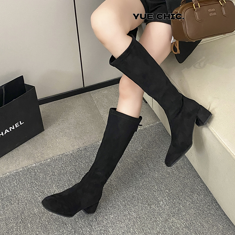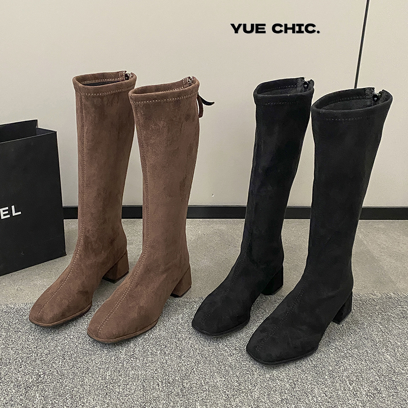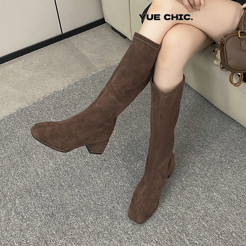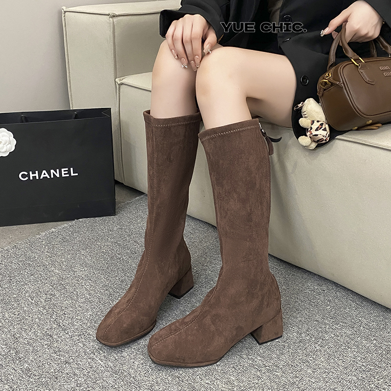 法式时装靴长靴显瘦长筒靴不过膝靴高筒靴女瘦瘦靴粗跟春秋棕色