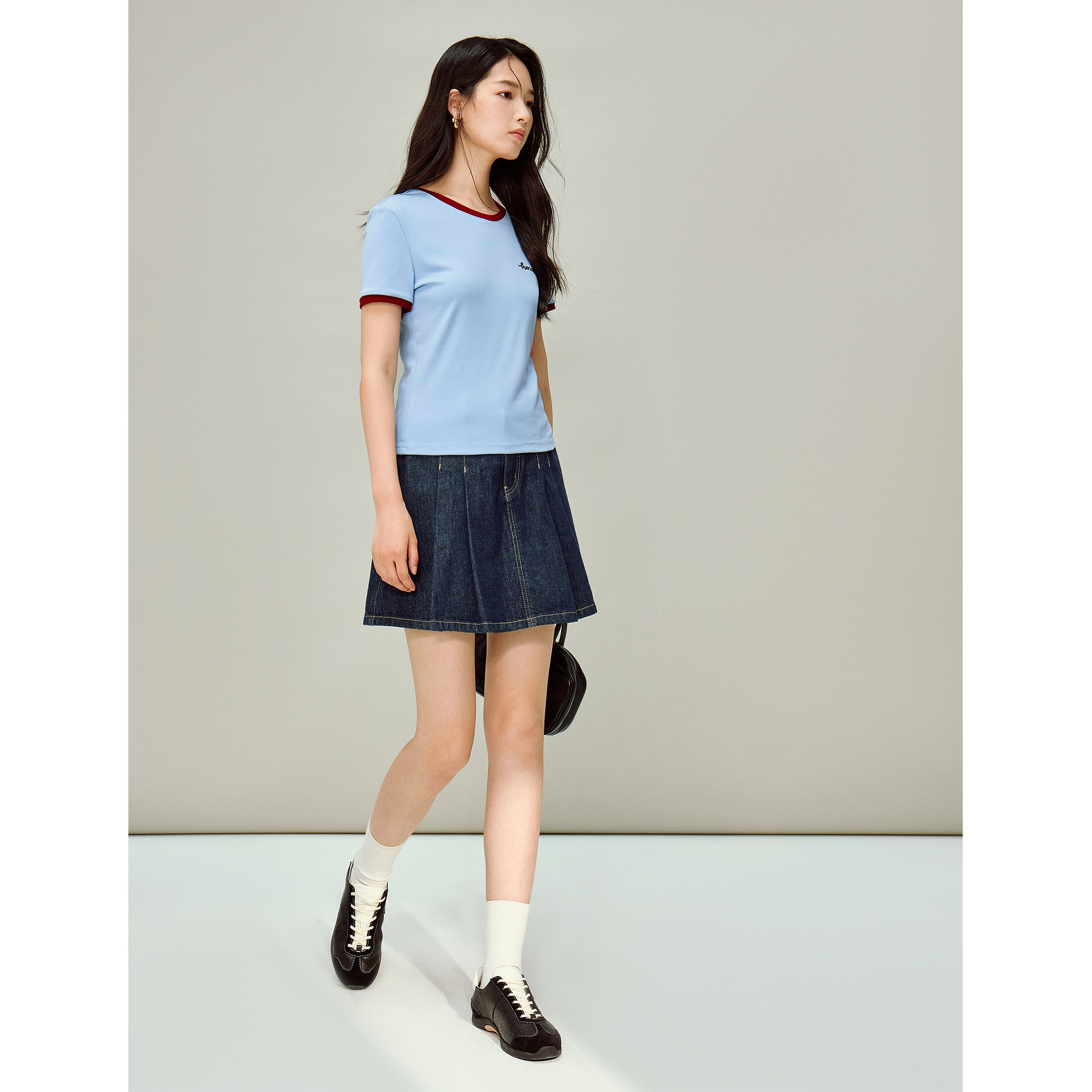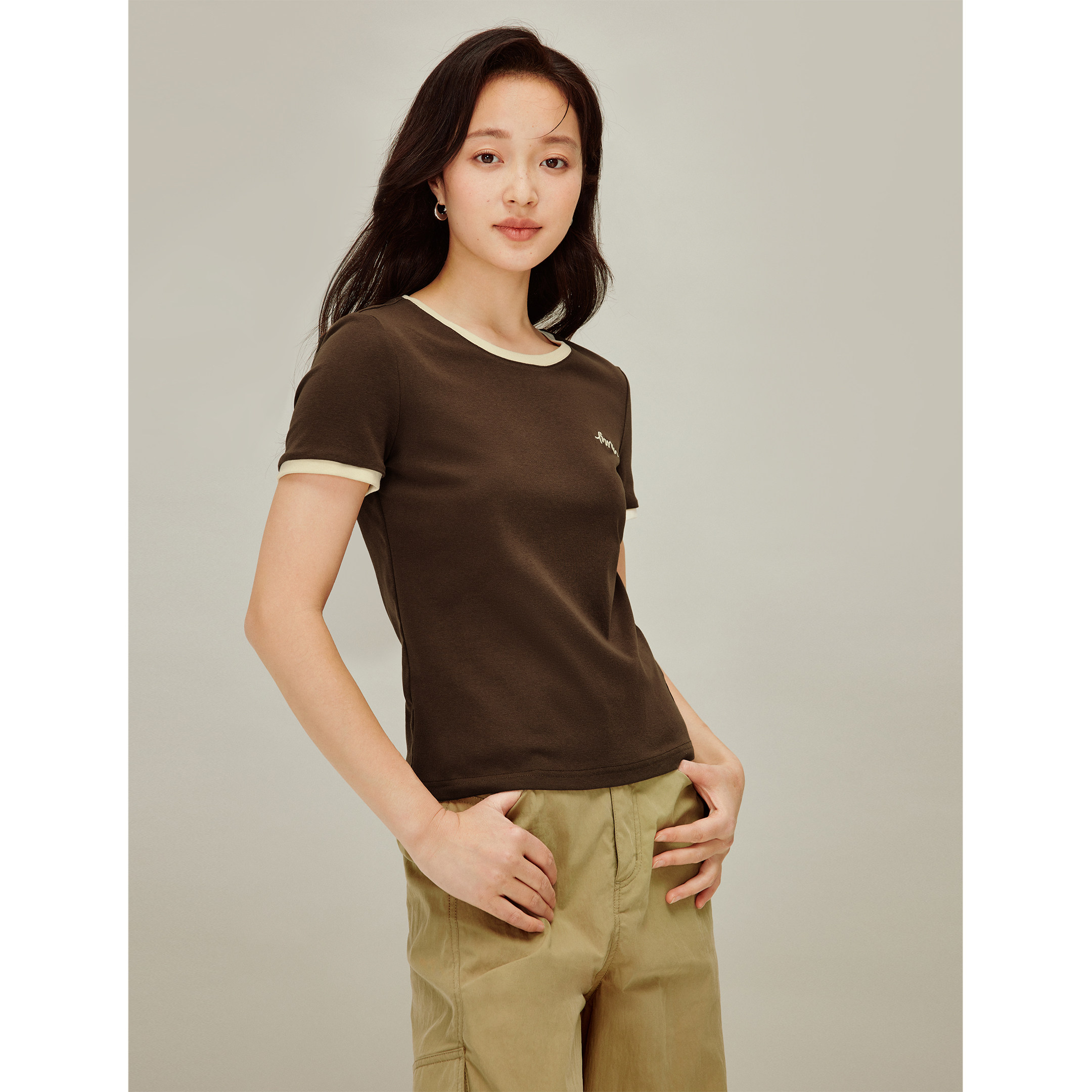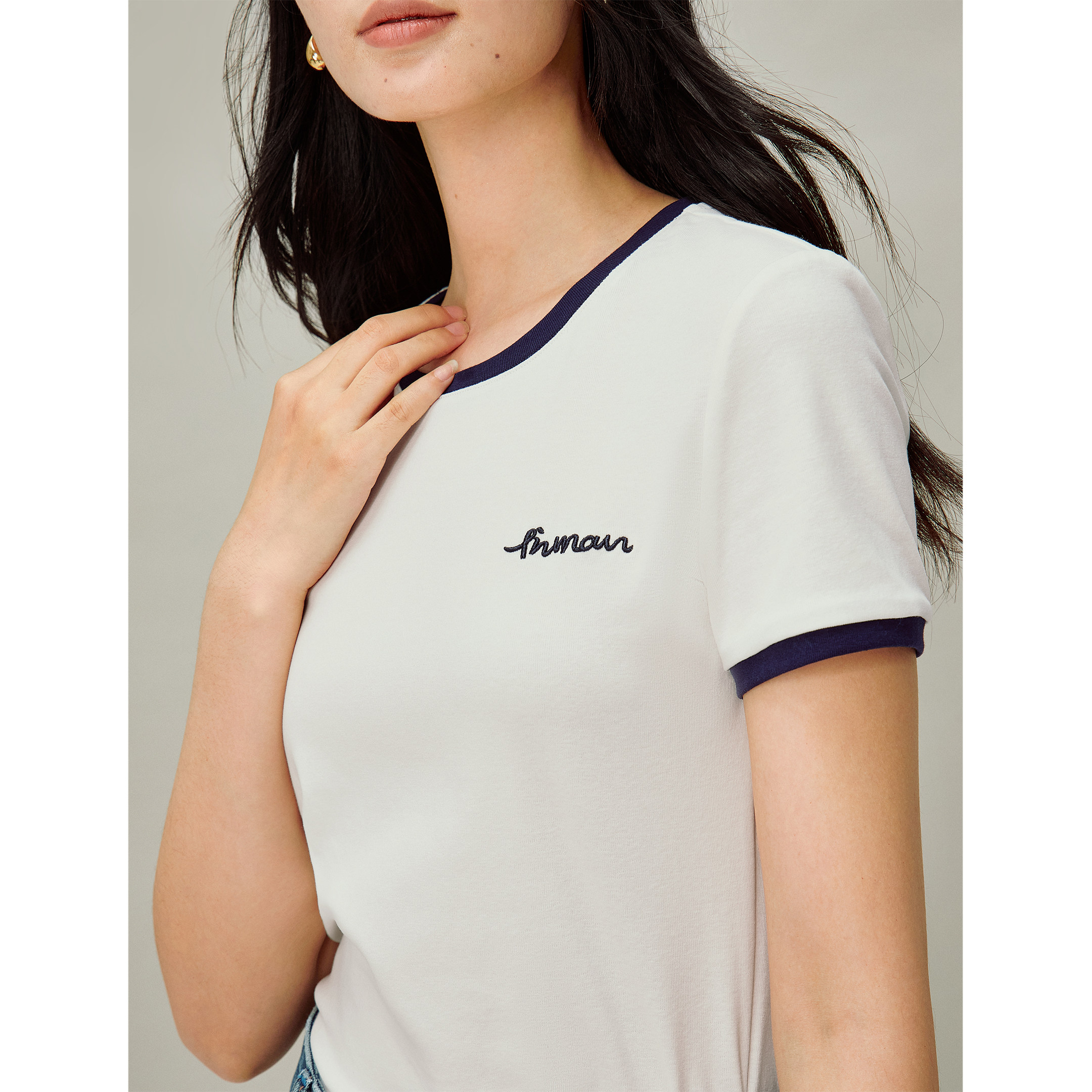 茵曼简约撞色圆领刺绣休闲百搭T恤2026春季女装新款显瘦短袖上衣
