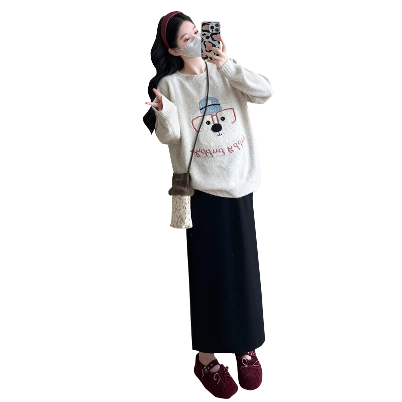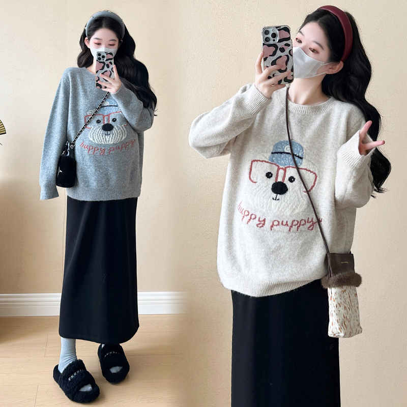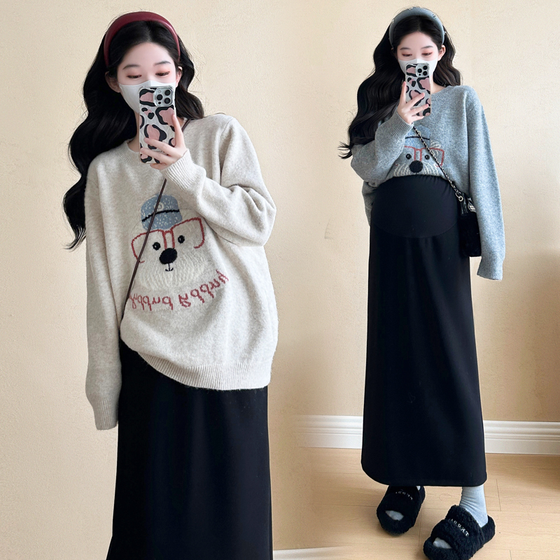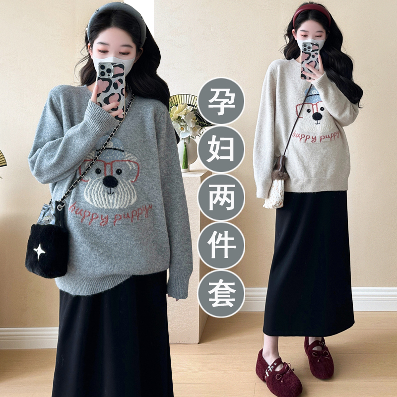 孕妇装秋冬季时尚卡通毛衣套装遮肚显瘦宽松上衣托腹半身裙两件套