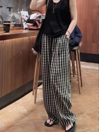 法式复古格子阔腿裤女夏季新款设计感简约休闲宽松高腰显瘦直筒裤