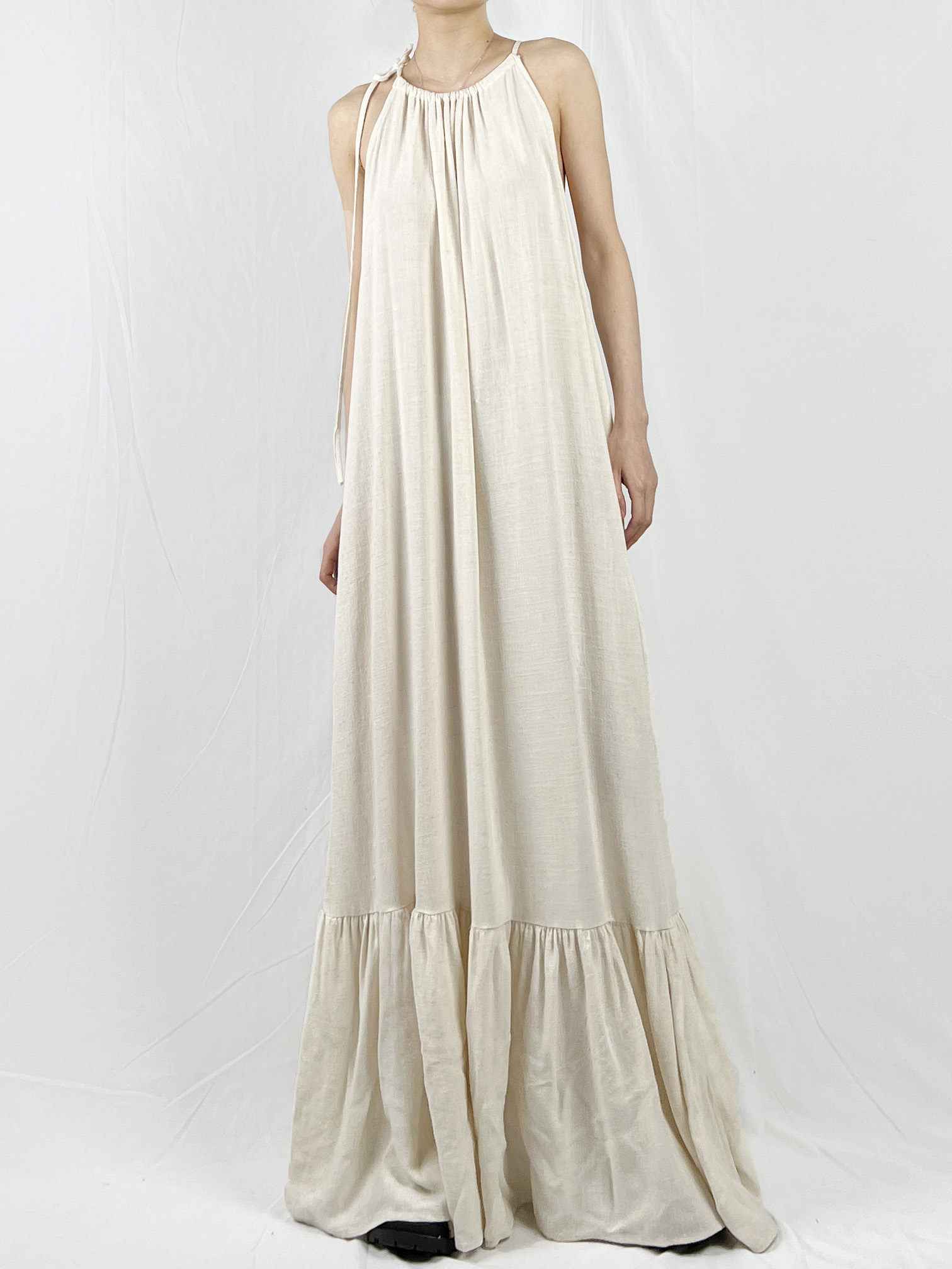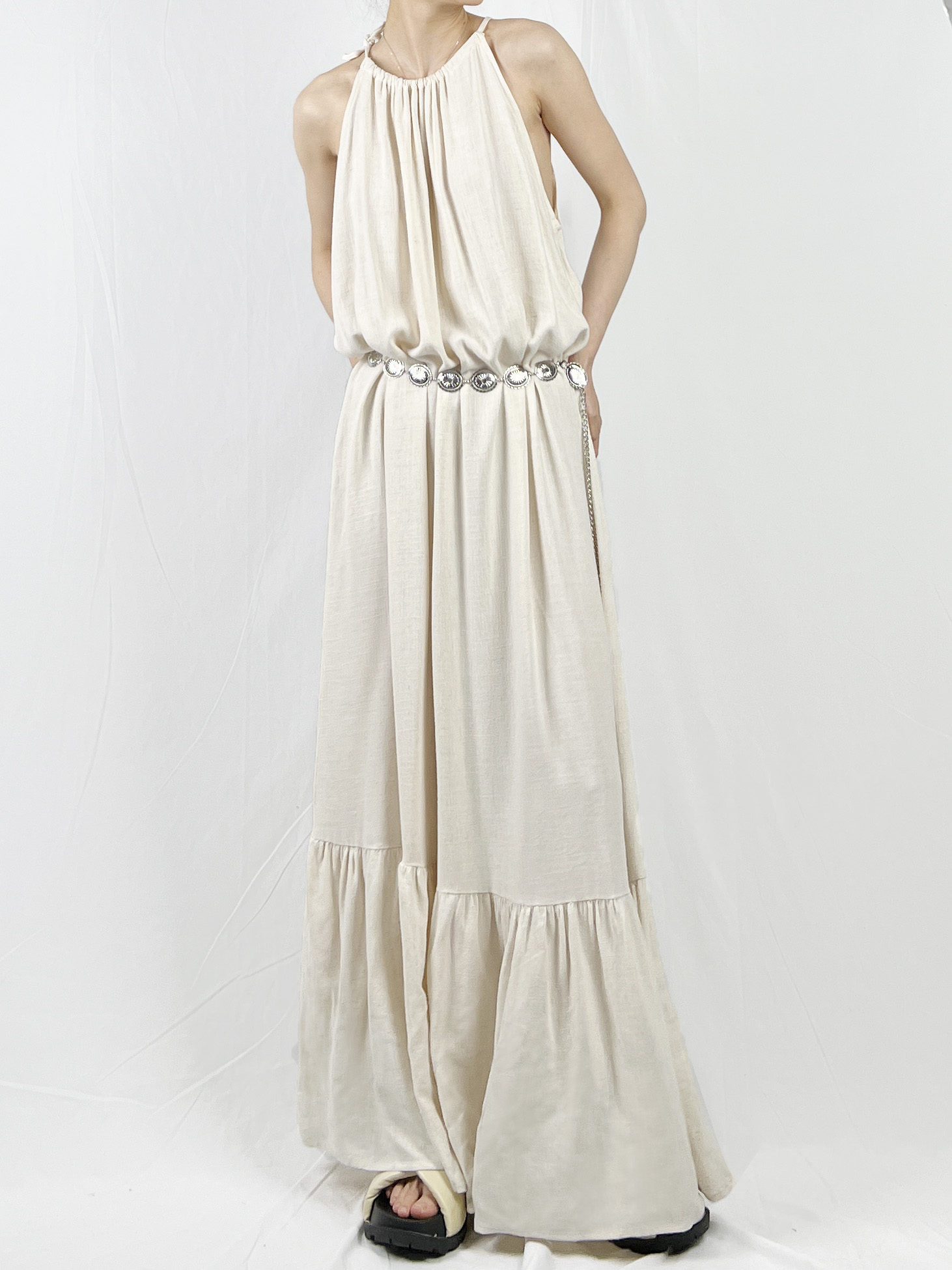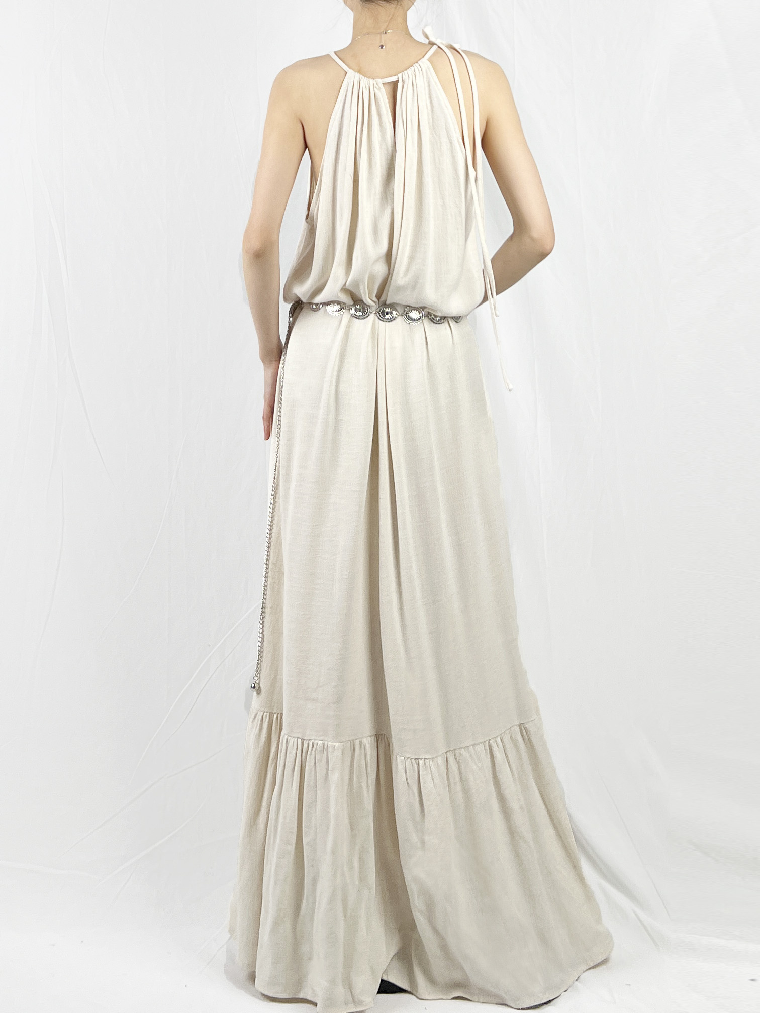 没2月 法式茶歇棉麻连衣裙女夏季气质慵懒度假挂脖无袖吊带长裙子